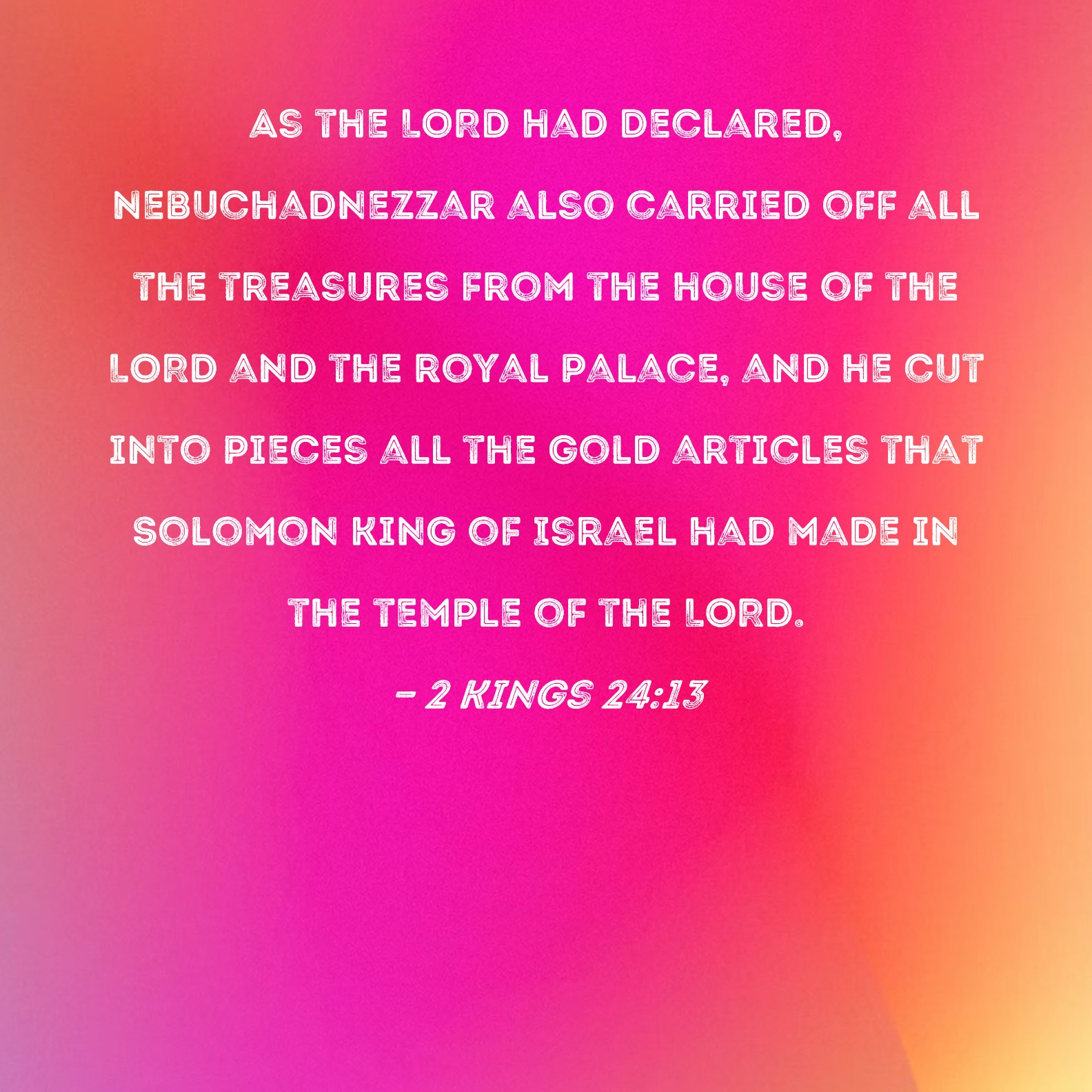 2 Kings 24:13 As the LORD had declared, Nebuchadnezzar also carried off all the treasures from the house of the LORD and the royal palace, and he cut into pieces all the gold articles that Solomon king of Israel had made in the temple of the LORD.