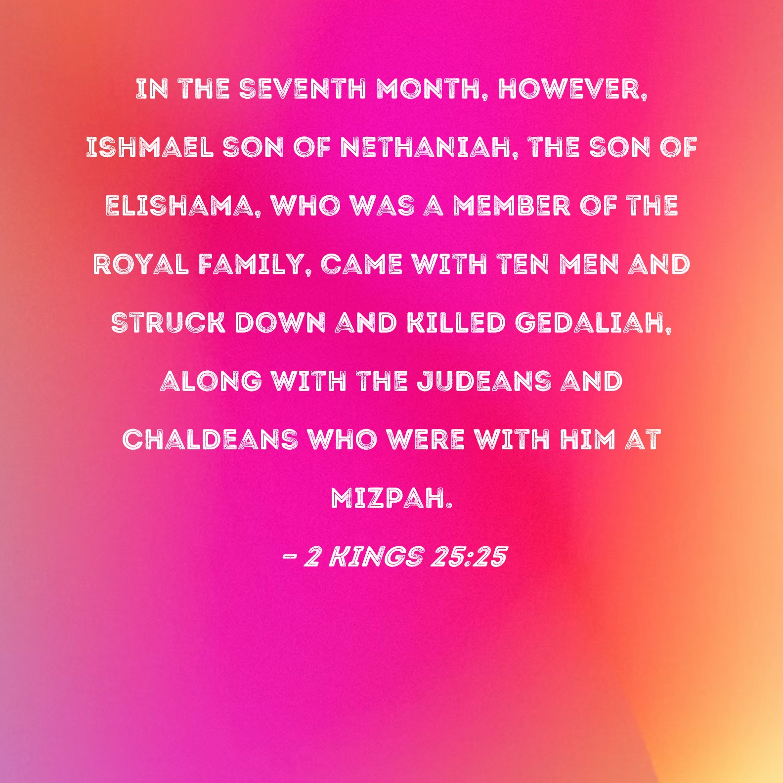 2 Kings 25:25 In the seventh month, however, Ishmael son of Nethaniah, the son of Elishama, who was a member of the royal family, came with ten men and struck down and killed Gedaliah, along with the Judeans and Chaldeans who were with him at Mizpah.