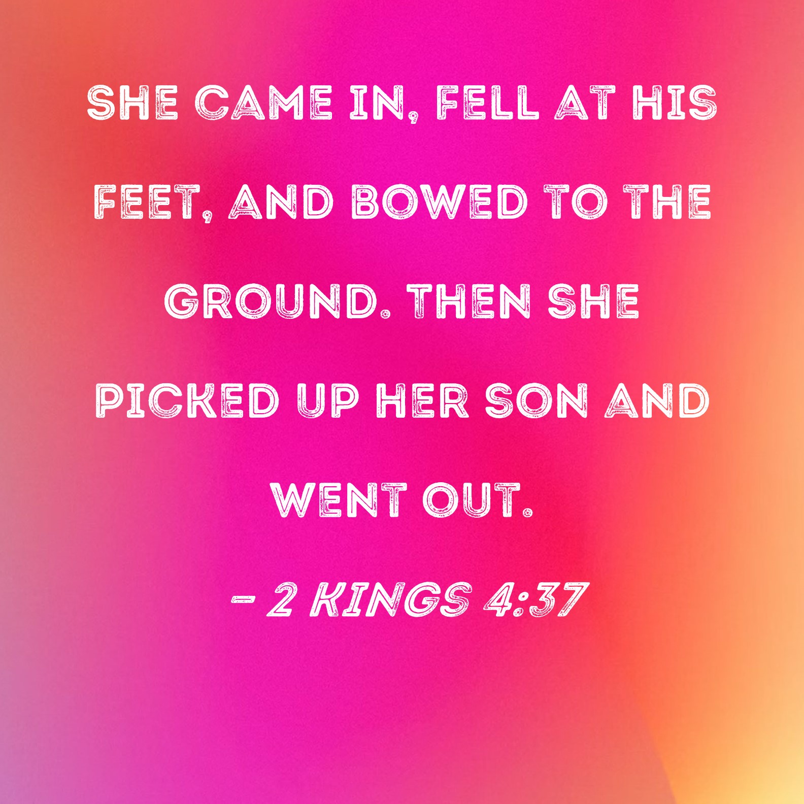 2 Kings 4:37 She came in, fell at his feet, and bowed to the ground. Then she picked up her son and went out.