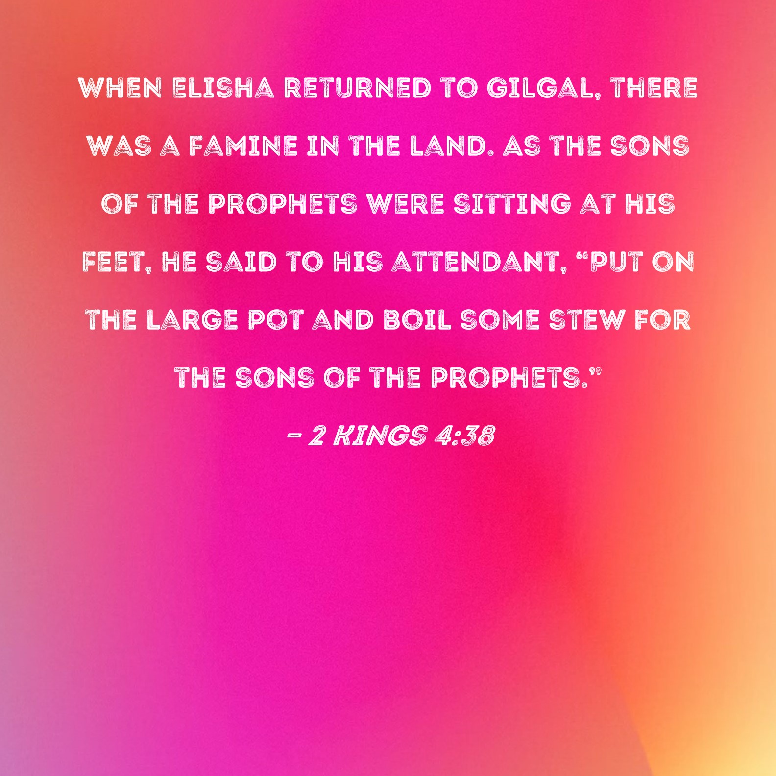 2 Kings 4:38 When Elisha returned to Gilgal, there was a famine in the land. As the sons of the prophets were sitting at his feet, he said to his attendant, "Put on the large pot and boil some stew for the sons of the prophets."