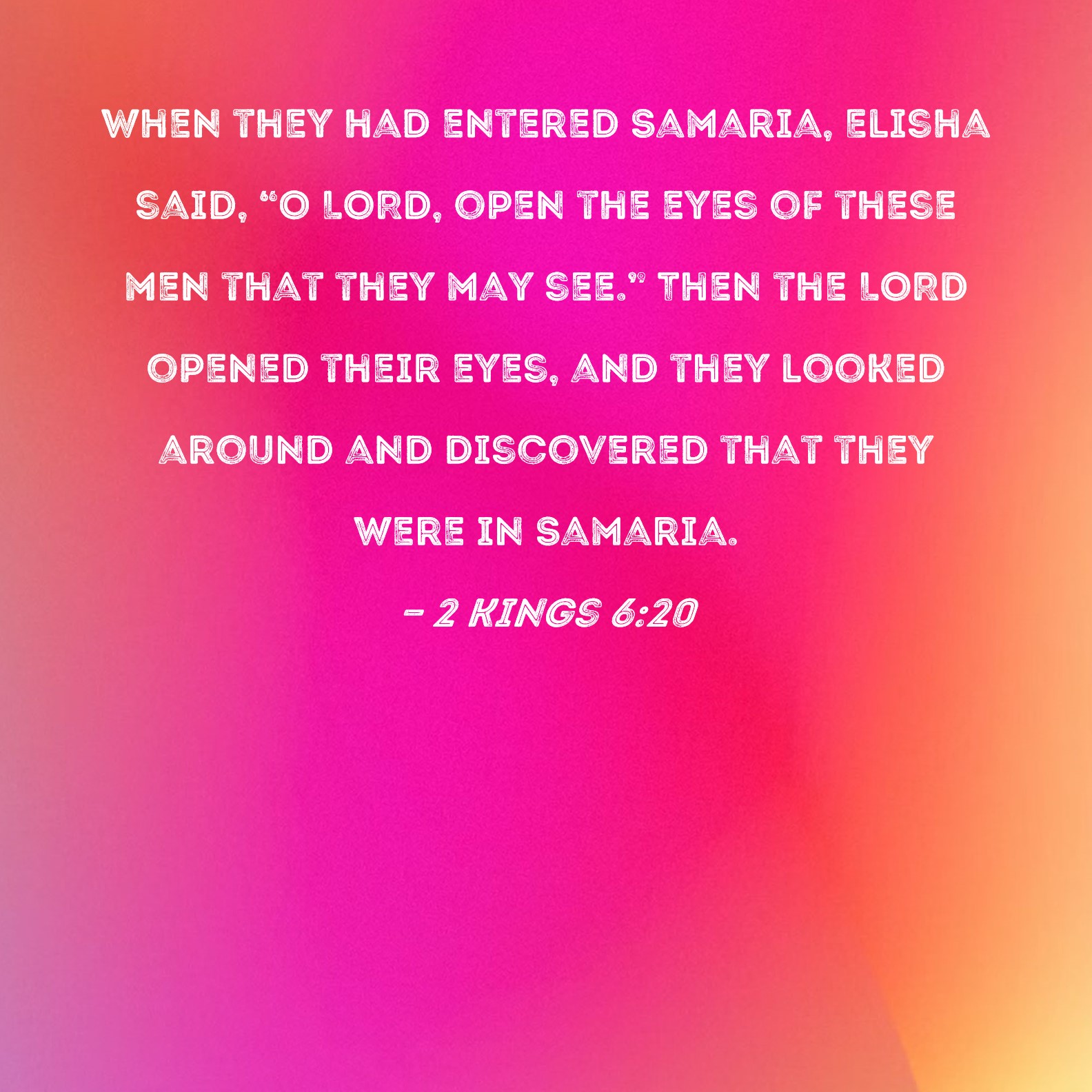 2 Kings 6:20 When they had entered Samaria, Elisha said, "O LORD, open the eyes of these men that they may see." Then the LORD opened their eyes, and they looked around and discovered that they were in Samaria.