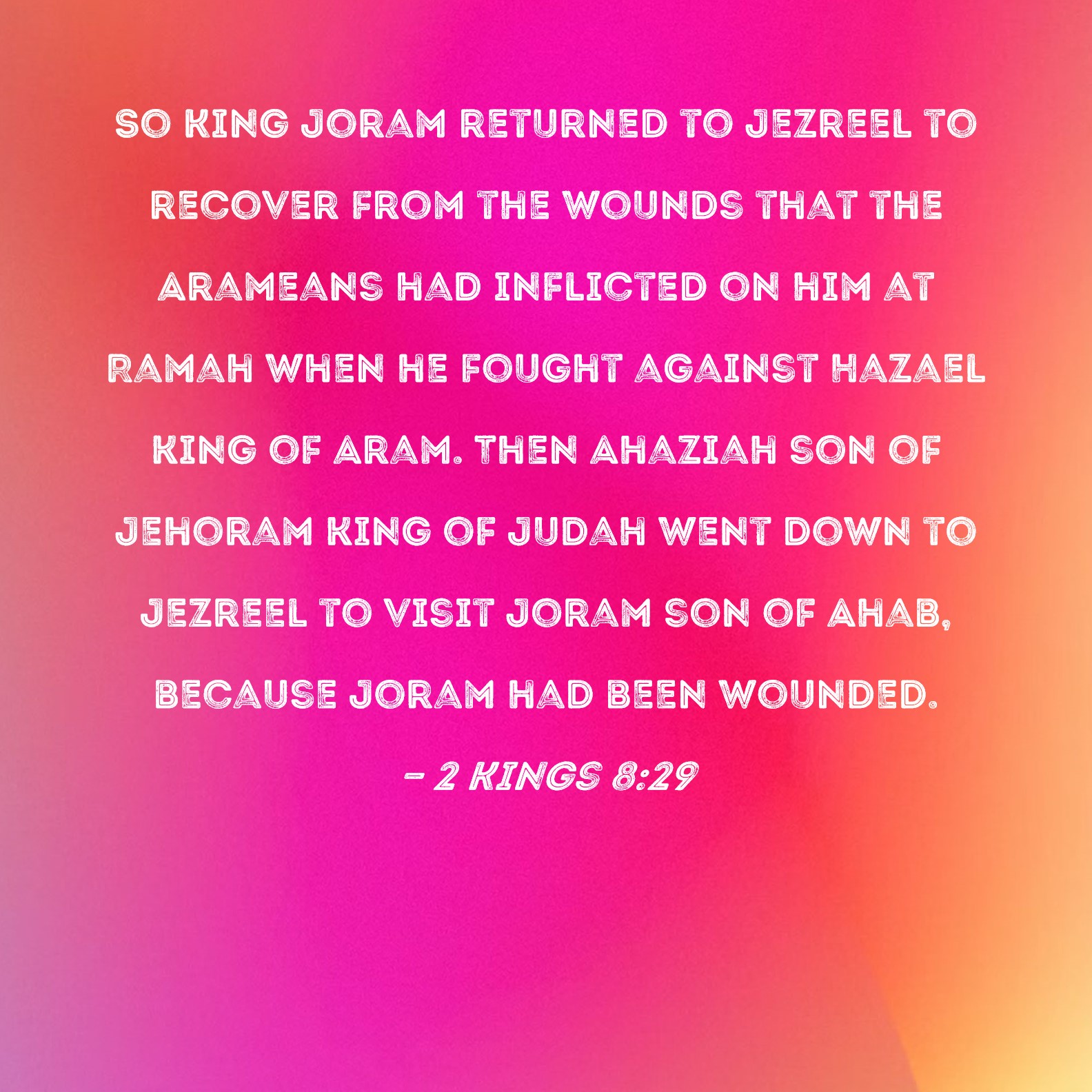 2 Kings 8:29 So King Joram returned to Jezreel to recover from the wounds that the Arameans had inflicted on him at Ramah when he fought against Hazael king of Aram. Then Ahaziah son of Jehoram king of Judah went down to Jezreel to visit Joram son of Ahab, because Joram had been wounded.