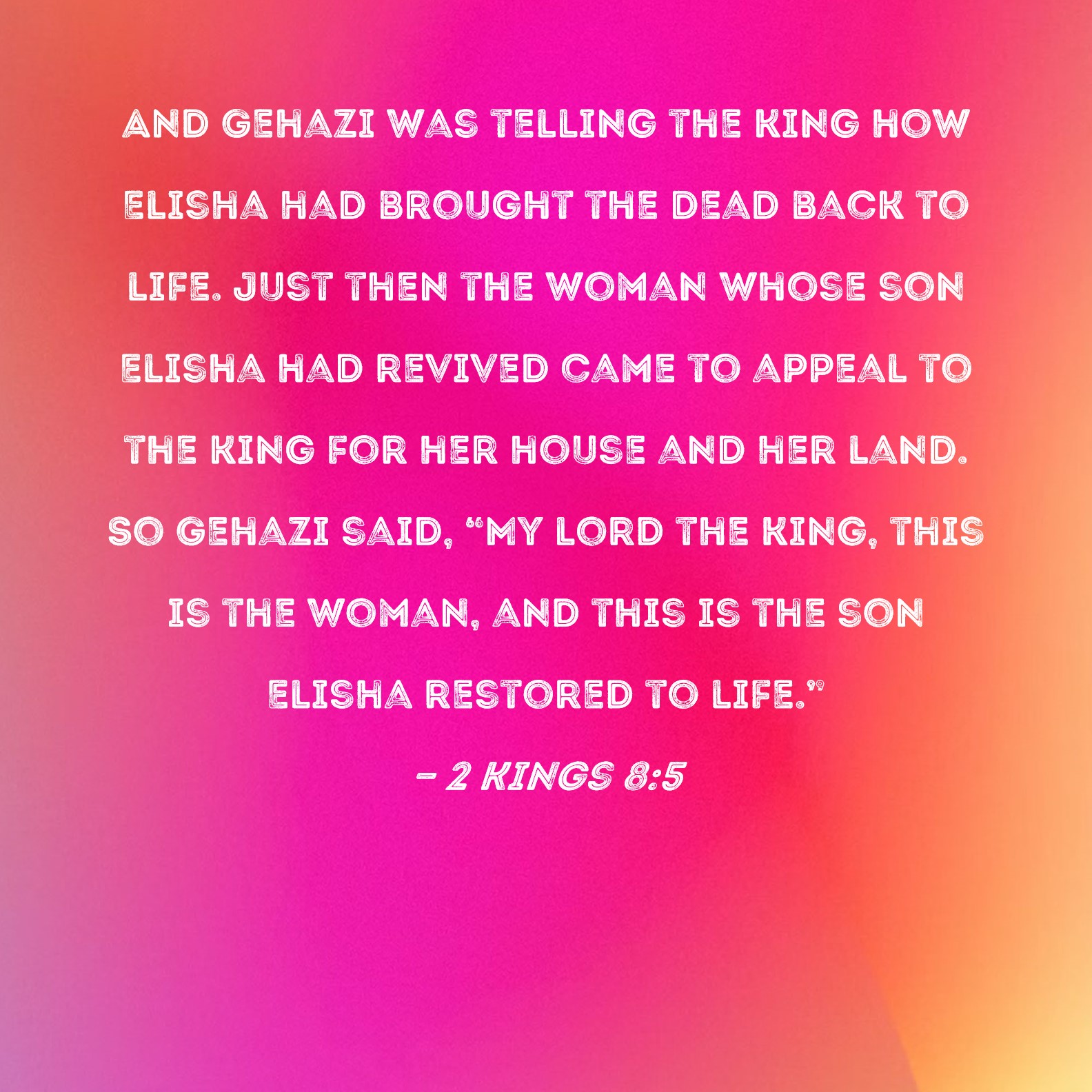 2 Kings 8:5 And Gehazi was telling the king how Elisha had brought the dead back to life. Just then the woman whose son Elisha had revived came to appeal to the king for her house and her land. So Gehazi said, "My lord the king, this is the woman, and this is the son Elisha restored to life."