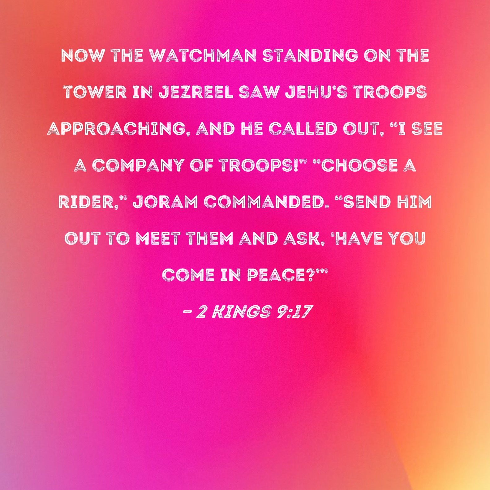 2 Kings 9:17 Now the watchman standing on the tower in Jezreel saw Jehu's troops approaching, and he called out, "I see a company of troops!" "Choose a rider," Joram commanded. "Send him out to meet them and ask, 'Have you come in peace?'"
