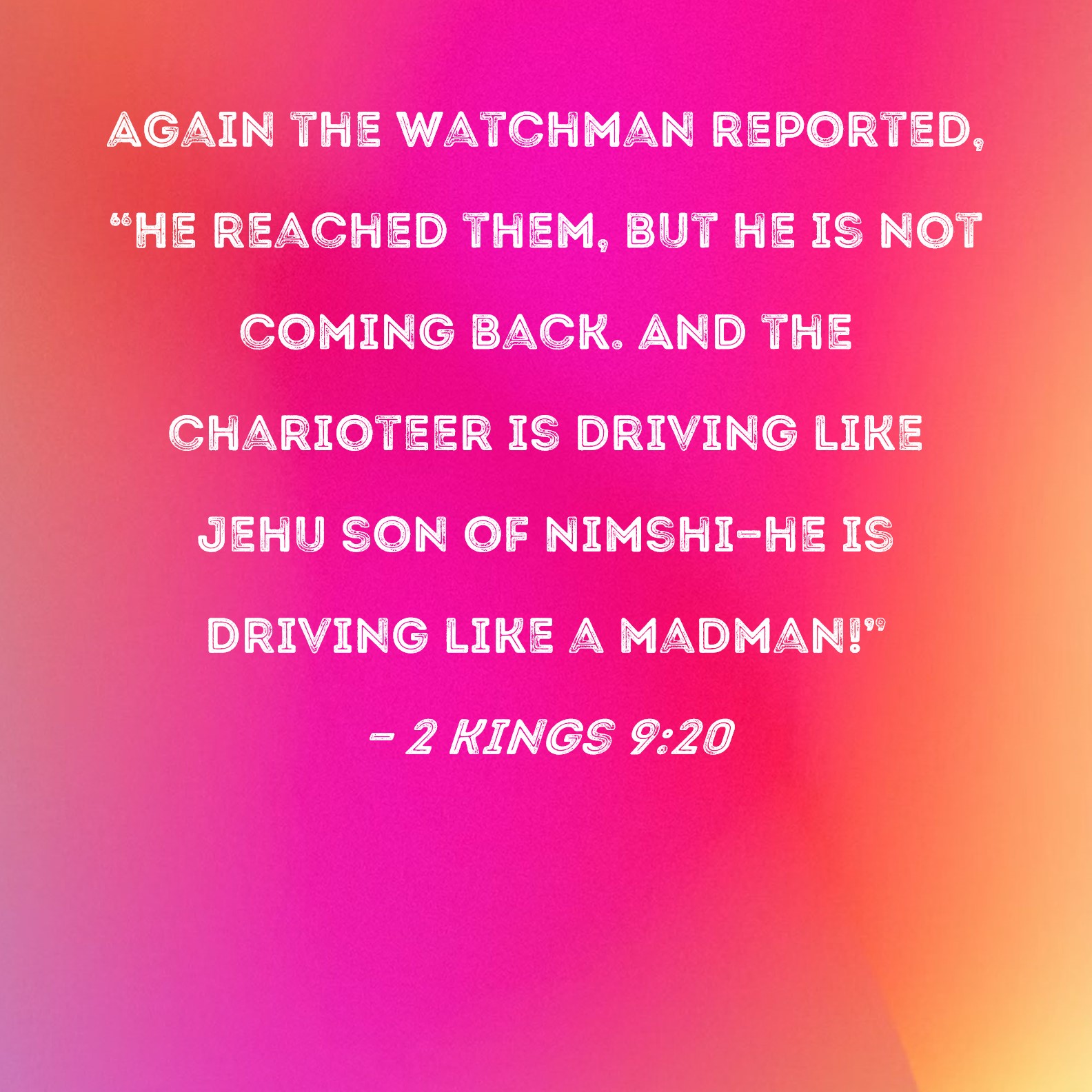 2 Kings 9:20 Again the watchman reported, "He reached them, but he is not coming back. And the charioteer is driving like Jehu son of Nimshi--he is driving like a madman!"