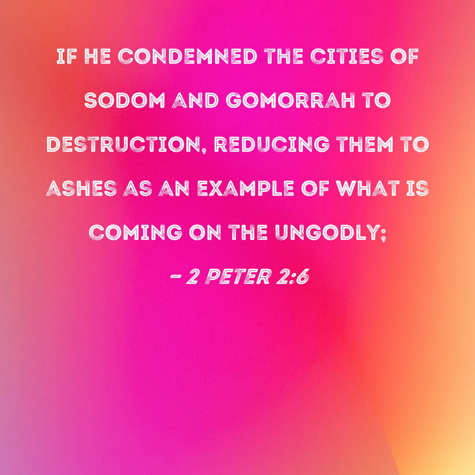 2 Peter 2:6 if He condemned the cities of Sodom and Gomorrah to destruction, reducing them to ashes as an example of what is coming on the ungodly;