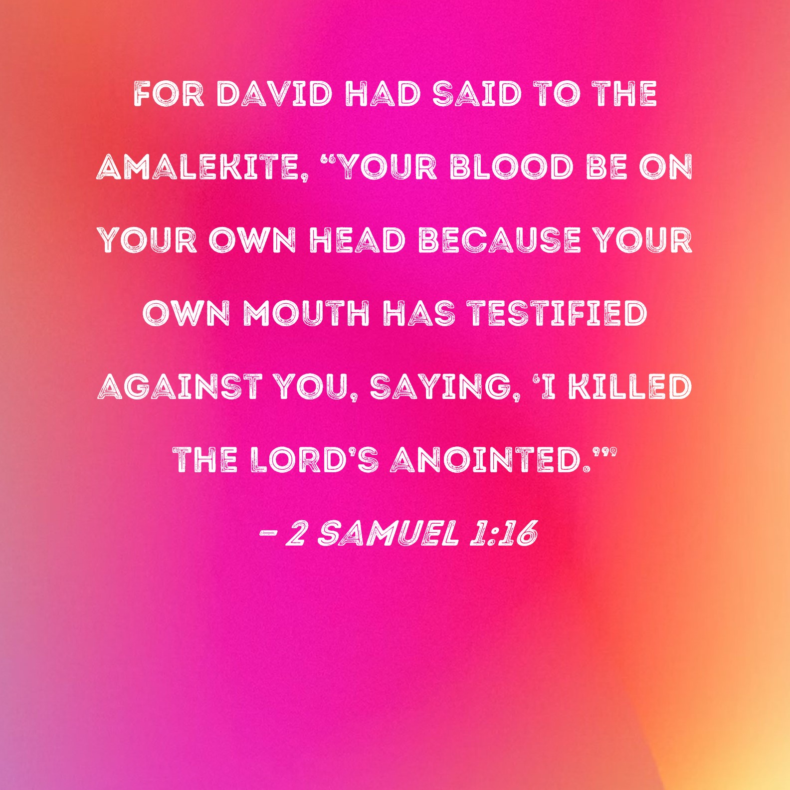 2 Samuel 1:16 For David had said to the Amalekite, "Your blood be on your own head because your own mouth has testified against you, saying, 'I killed the LORD's anointed.'"