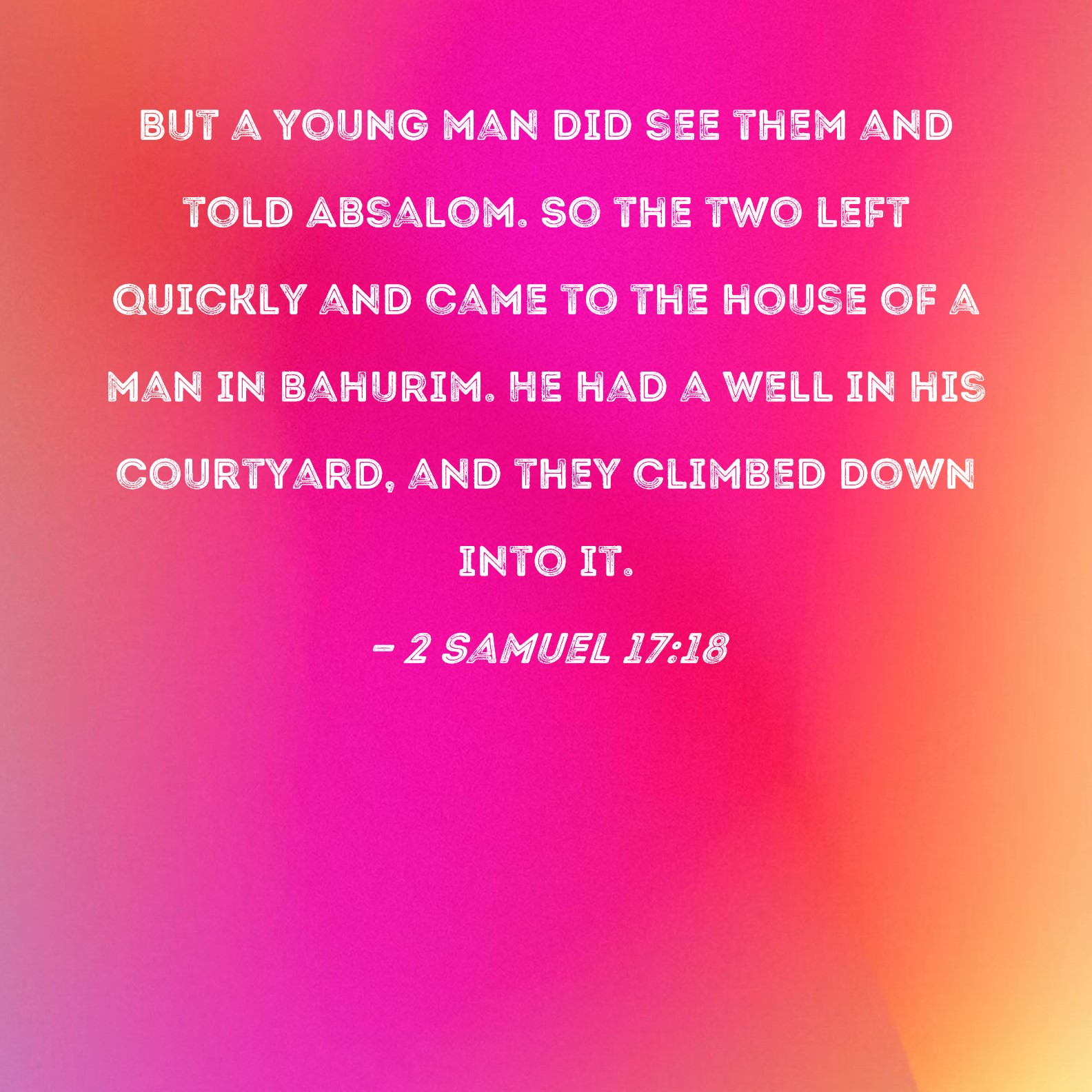 BSB:  But a young man did see them and told Absalom. So the two left quickly and came to the house of a man in Bahurim. He had a well in his courtyard, and they climbed down into it.