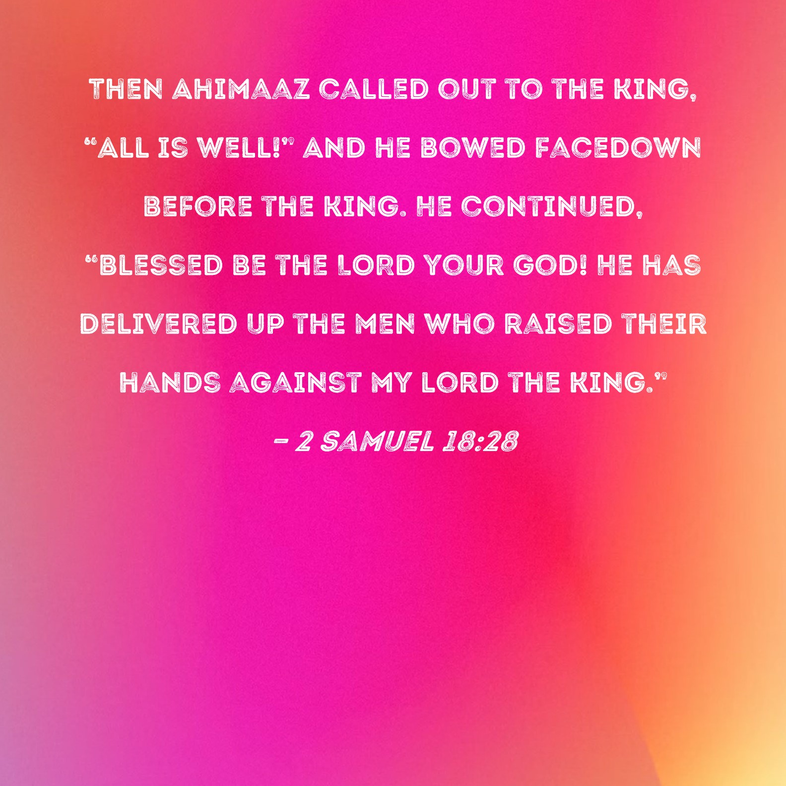 2 Samuel 18:28 Then Ahimaaz called out to the king, "All is well!" And he bowed facedown before the king. He continued, "Blessed be the LORD your God! He has delivered up the men who raised their hands against my lord the king."