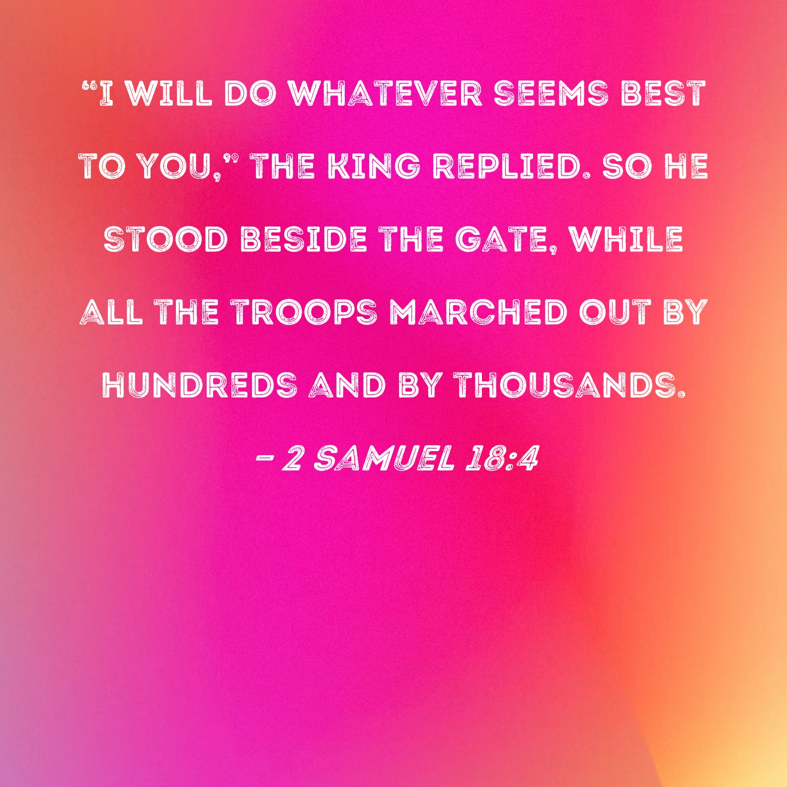 2 Samuel 18:4 "I will do whatever seems best to you," the king replied. So he stood beside the gate, while all the troops marched out by hundreds and by thousands.