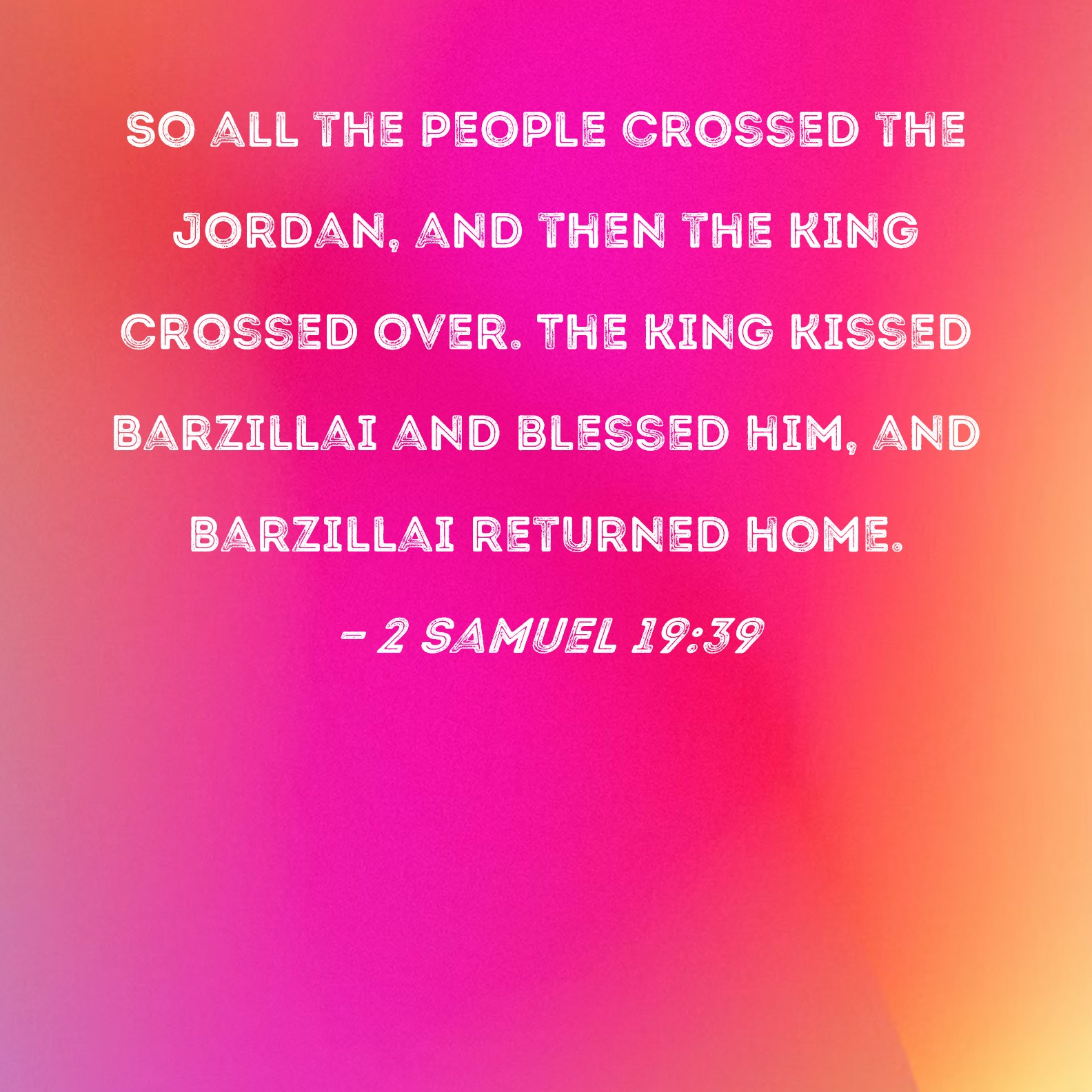 2 Samuel 19:39 So all the people crossed the Jordan, and then the king crossed over. The king kissed Barzillai and blessed him, and Barzillai returned home.