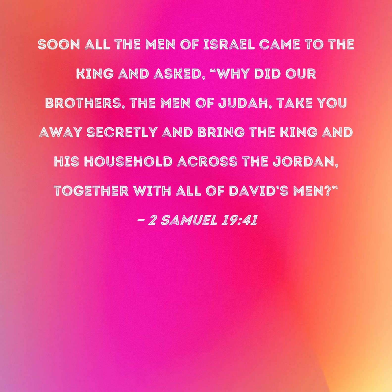 2 Samuel 19:41 Soon all the men of Israel came to the king and asked, "Why did our brothers, the men of Judah, take you away secretly and bring the king and his household across the Jordan, together with all of David's men?"
