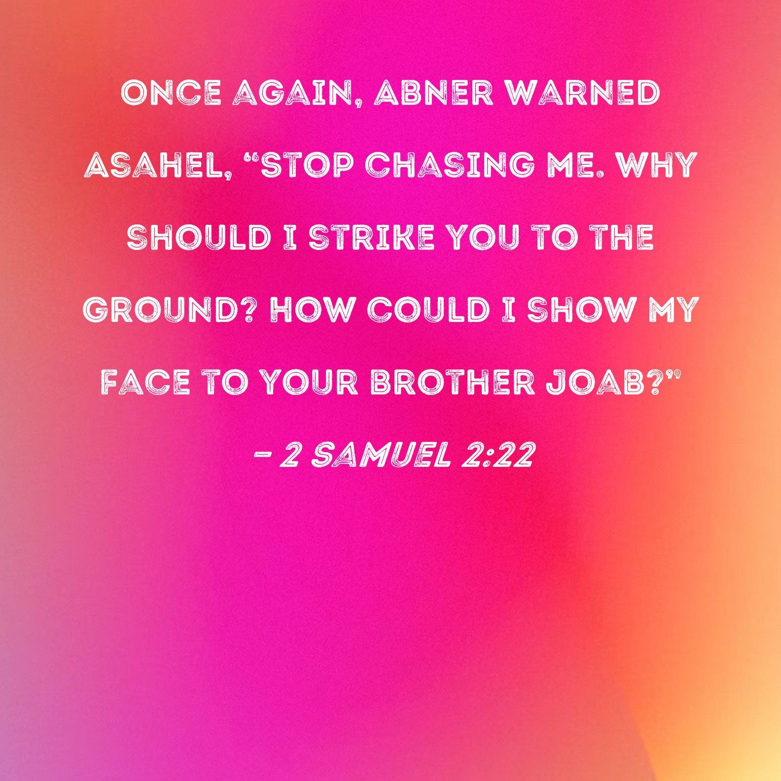 2 Samuel 2:22 Once again, Abner warned Asahel, "Stop chasing me. Why should I strike you to the ground? How could I show my face to your brother Joab?"