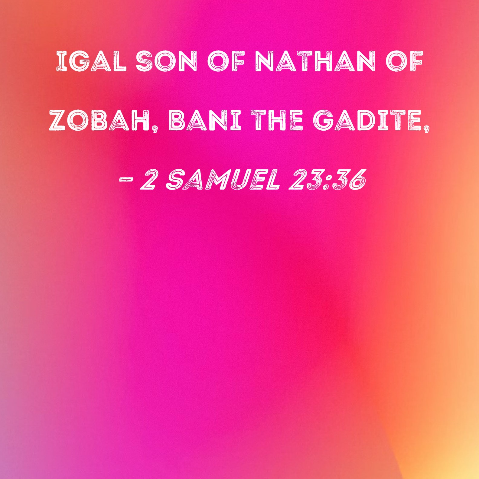 BSB: Igal son of Nathan of Zobah, Bani the Gadite, KJV: Igal the son of Nathan of Zobah, Bani the Gadite, DRB: Igaal the son of Nathan of Soba, Bonni of Gadi, DBT: Igal the son of Nathan of Zobah, Bani the Gadite, ERV: Igal the son of Nathan of Zobah, Bani the Gadite; WBT: Igal the son of Nathan of Zobah, Bani, the Gadite, WEB: Igal the son of Nathan of Zobah, Bani the Gadite, YLT: Igal son of Nathan from Zobah, Bani the Gadite,Links 2 Samuel 23:36 NIV • 2 Samuel 23:36 NLT • 2 Samuel 23:36 ESV • 2 Samuel 23:36 NASB • 2 Samuel 23:36 KJV • 2 Samuel 23:36 Interlinear • 2 Samuel 23:36 Commentaries • 2 Samuel 23:36 Parallel Texts • 2 Samuel 23:36 Bible Apps • 2 Samuel 23:36 Parallel • Bible Hub |