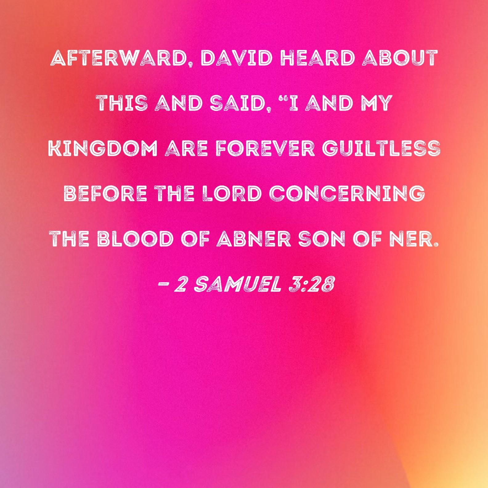 2 Samuel 3:28 Afterward, David heard about this and said, "I and my kingdom are forever guiltless before the LORD concerning the blood of Abner son of Ner.