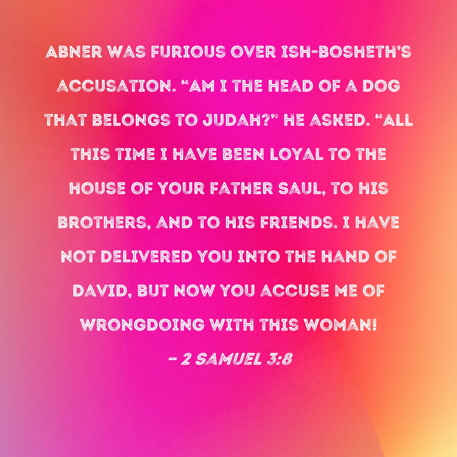 2 Samuel 3:8 Abner was furious over Ish-bosheth's accusation. "Am I the head of a dog that belongs to Judah?" he asked. "All this time I have been loyal to the house of your father Saul, to his brothers, and to his friends. I have not delivered you into the hand of David, but now you accuse me of wrongdoing with this woman!