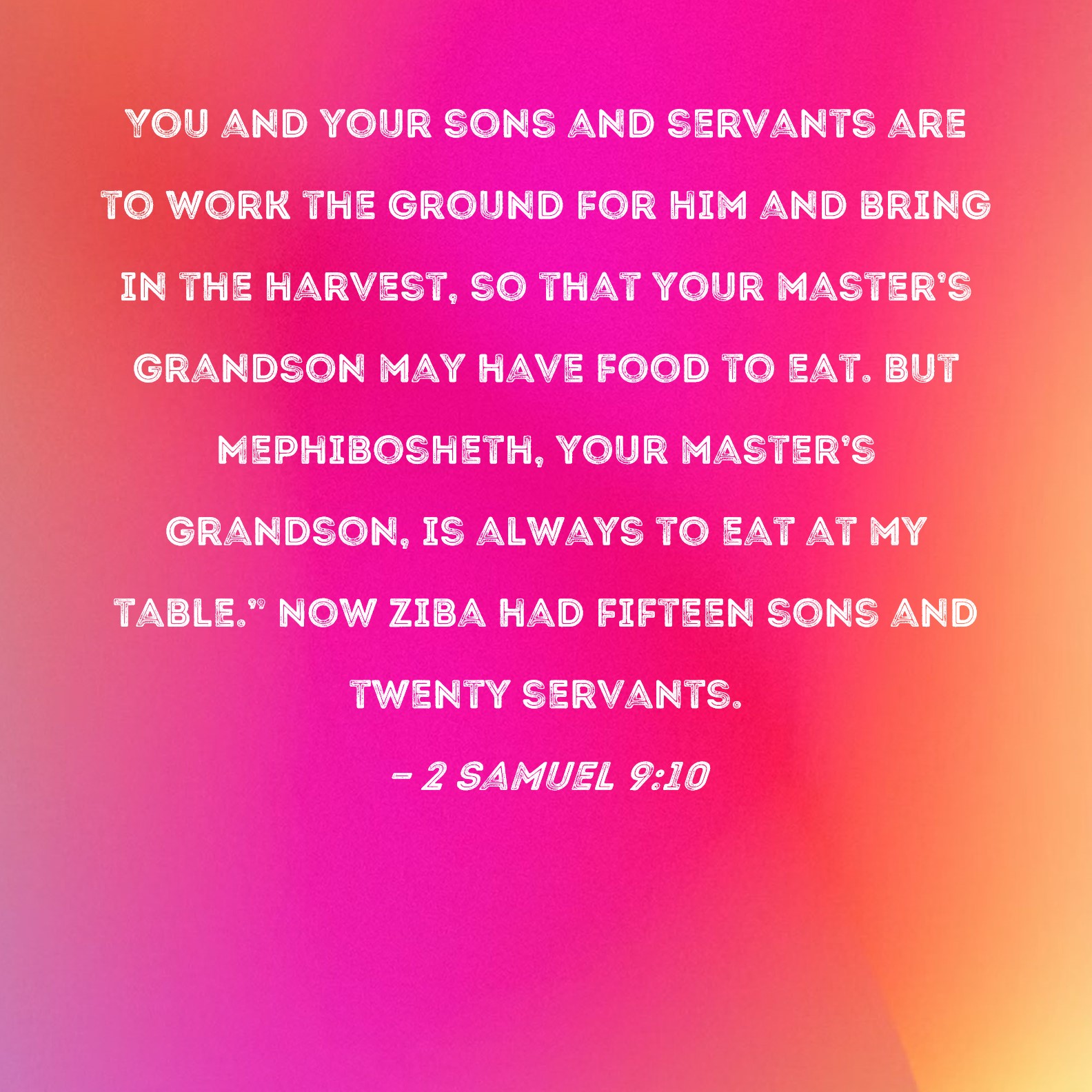 2 Samuel 9:10 You and your sons and servants are to work the ground for him and bring in the harvest, so that your master's grandson may have food to eat. But Mephibosheth, your master's grandson, is always to eat at my table." Now Ziba had fifteen sons and twenty servants.