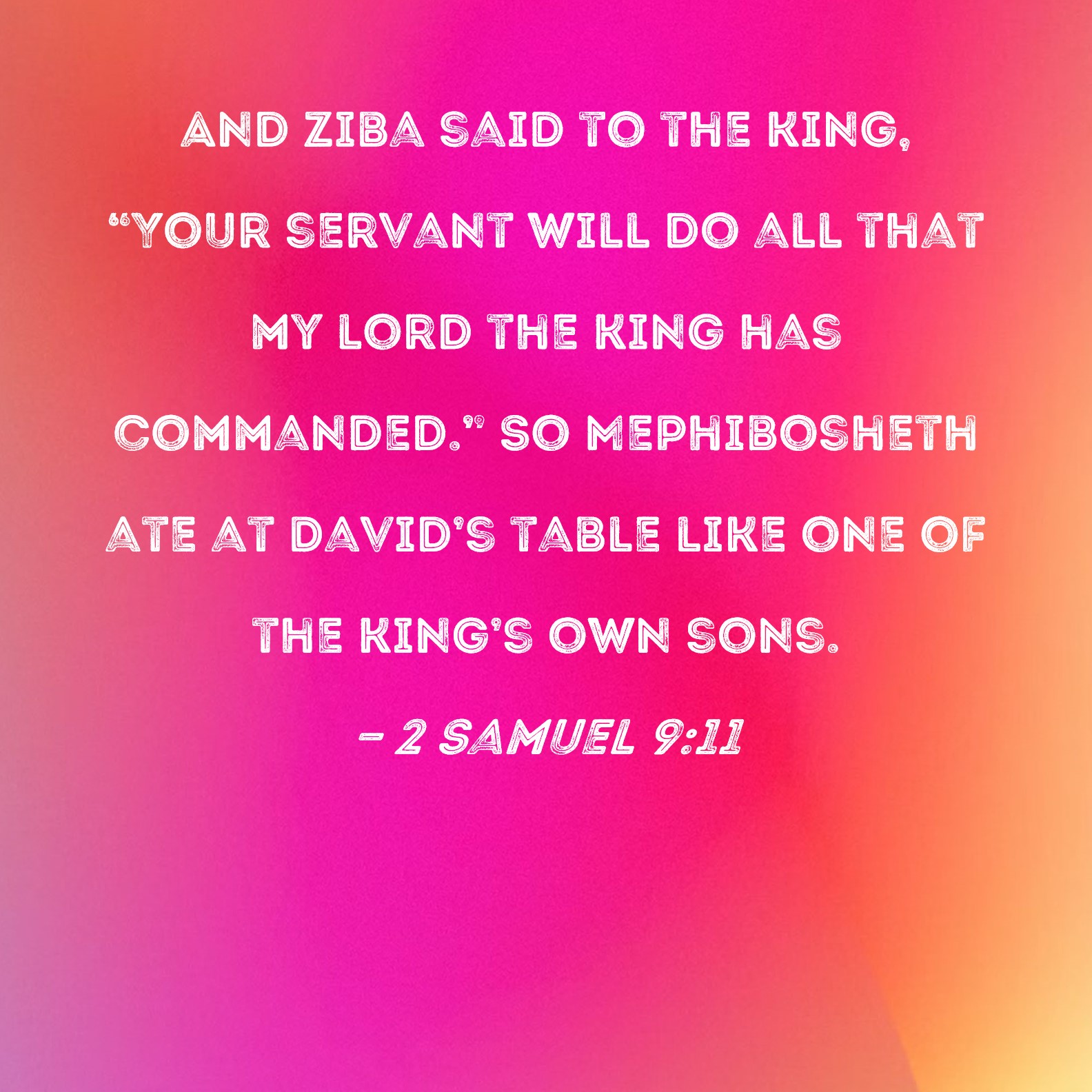 2 Samuel 9:11 And Ziba said to the king, "Your servant will do all that my lord the king has commanded." So Mephibosheth ate at David's table like one of the king's own sons.