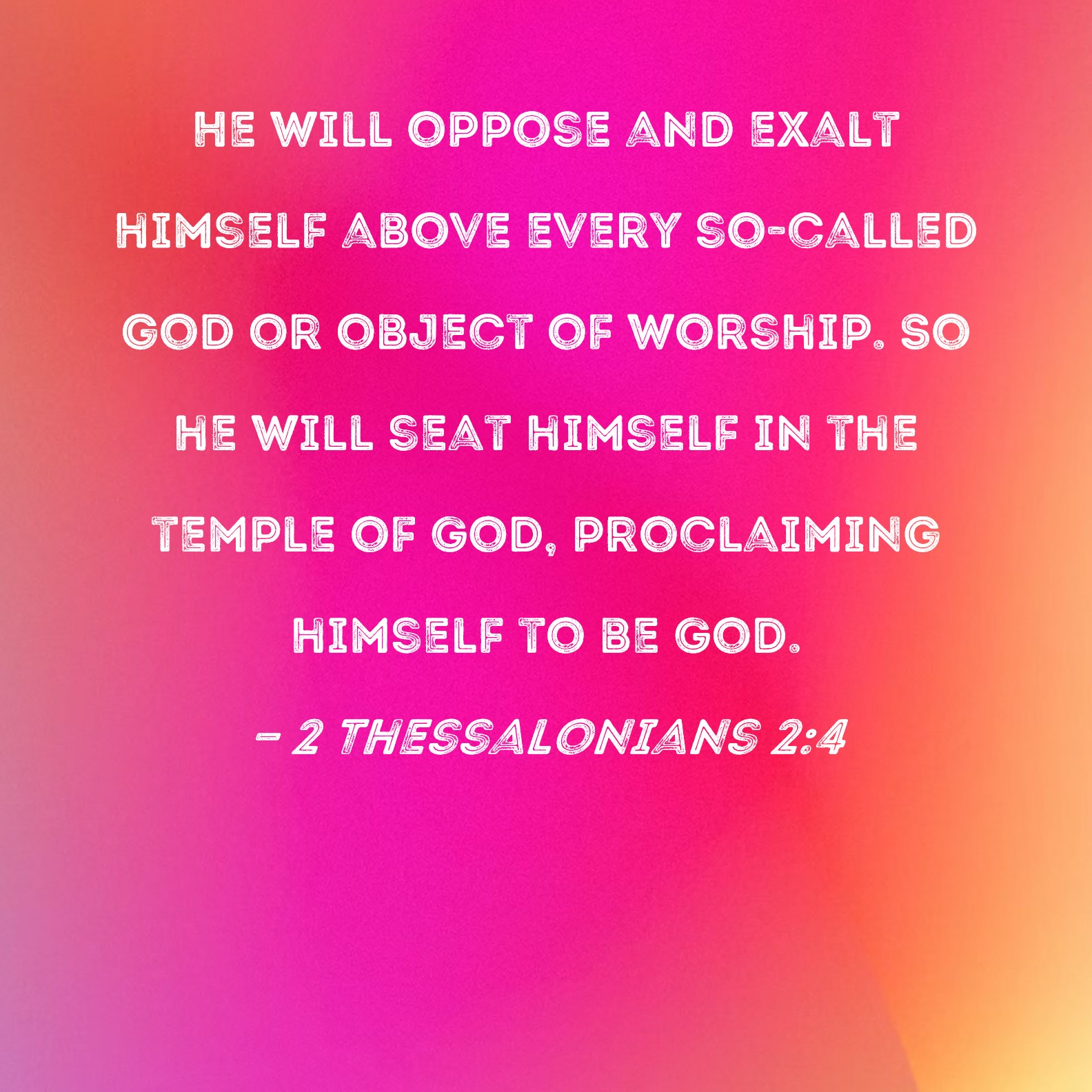 2 Thessalonians 2:4 He will oppose and exalt himself above every so-called god or object of worship. So he will seat himself in the temple of God, proclaiming himself to be God.