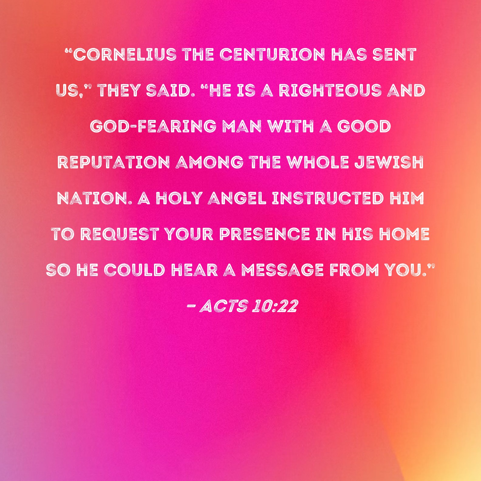Acts 10:22 "Cornelius the centurion has sent us," they said. "He is a righteous and God-fearing man with a good reputation among the whole Jewish nation. A holy angel instructed him to request your presence in his home so he could hear a message from you."