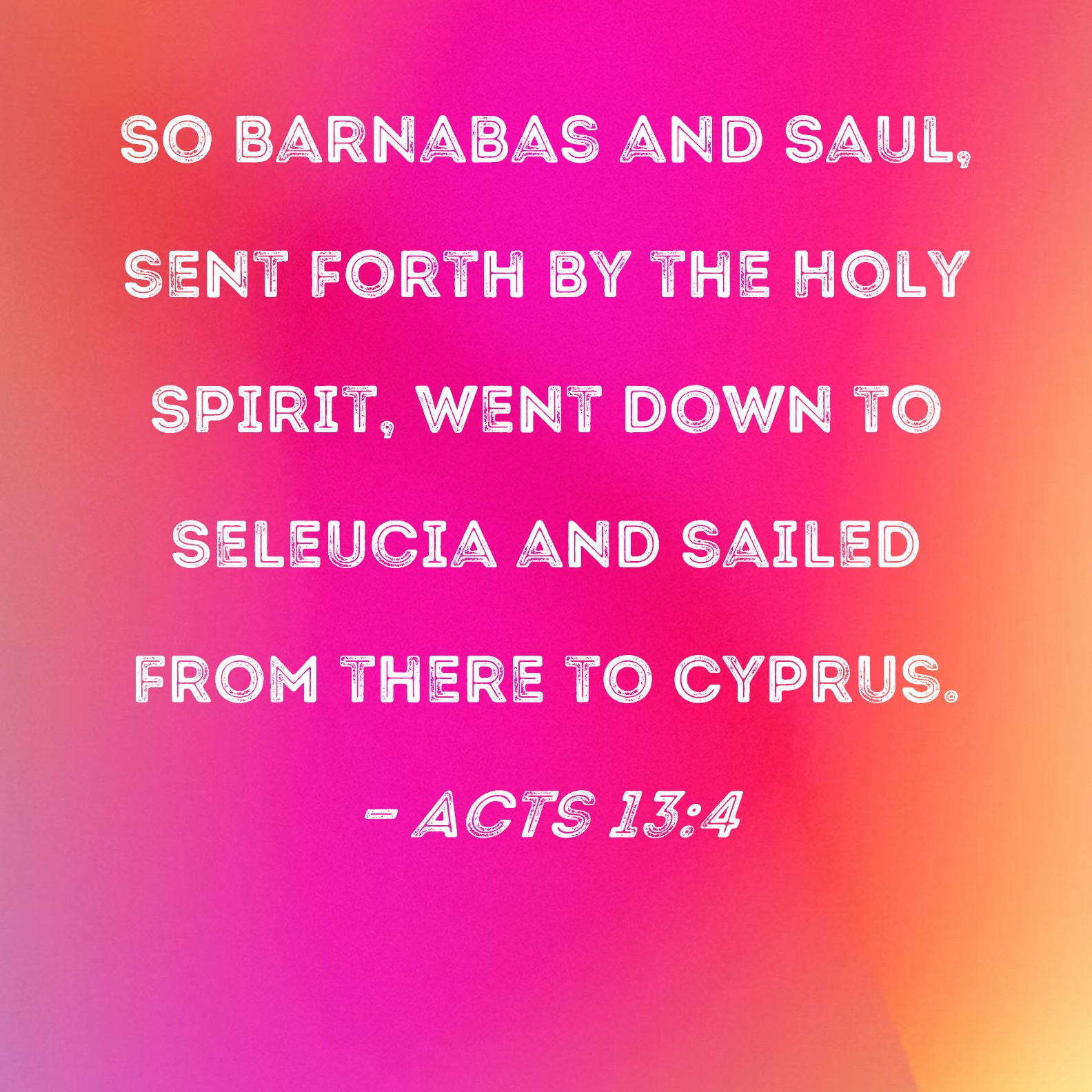 BSB: So Barnabas and Saul, sent forth by the Holy Spirit, went down to Seleucia and sailed from there to Cyprus. KJV: So they, being sent forth by the Holy Ghost, departed unto Seleucia; and from thence they sailed to Cyprus. DRB: So they being sent by the Holy Ghost, went to Seleucia: and from thence they sailed to Cyprus. DBT: They therefore, having been sent forth by the Holy Spirit, went down to Seleucia, and thence sailed away to Cyprus. ERV: So they, being sent forth by the Holy Ghost, went down to Seleucia; and from thence they sailed to Cyprus. WBT: So they being sent forth by the Holy Spirit, departed to Seleucia; and from thence they sailed to Cyprus. WEB: So, being sent out by the Holy Spirit, they went down to Seleucia. From there they sailed to Cyprus. YLT: These, indeed, then, having been sent forth by the Holy Spirit, went down to Seleucia, thence also they sailed to Cyprus,Links Acts 13:4 NIV • Acts 13:4 NLT • Acts 13:4 ESV • Acts 13:4 NASB • Acts 13:4 KJV • Acts 13:4 Interlinear • Acts 13:4 Commentaries • Acts 13:4 Parallel Texts • Acts 13:4 Bible Apps • Acts 13:4 Parallel • Bible Hub |