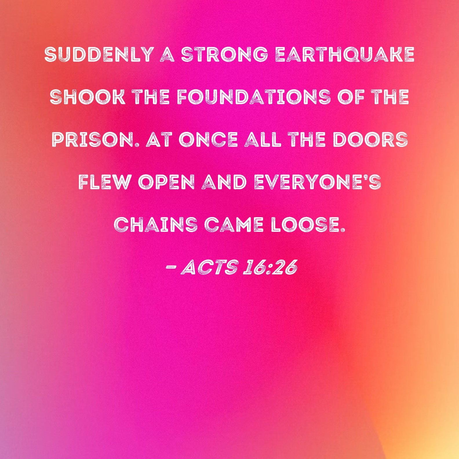 Acts 16:26 Suddenly a strong earthquake shook the foundations of the prison. At once all the doors flew open and everyone's chains came loose.