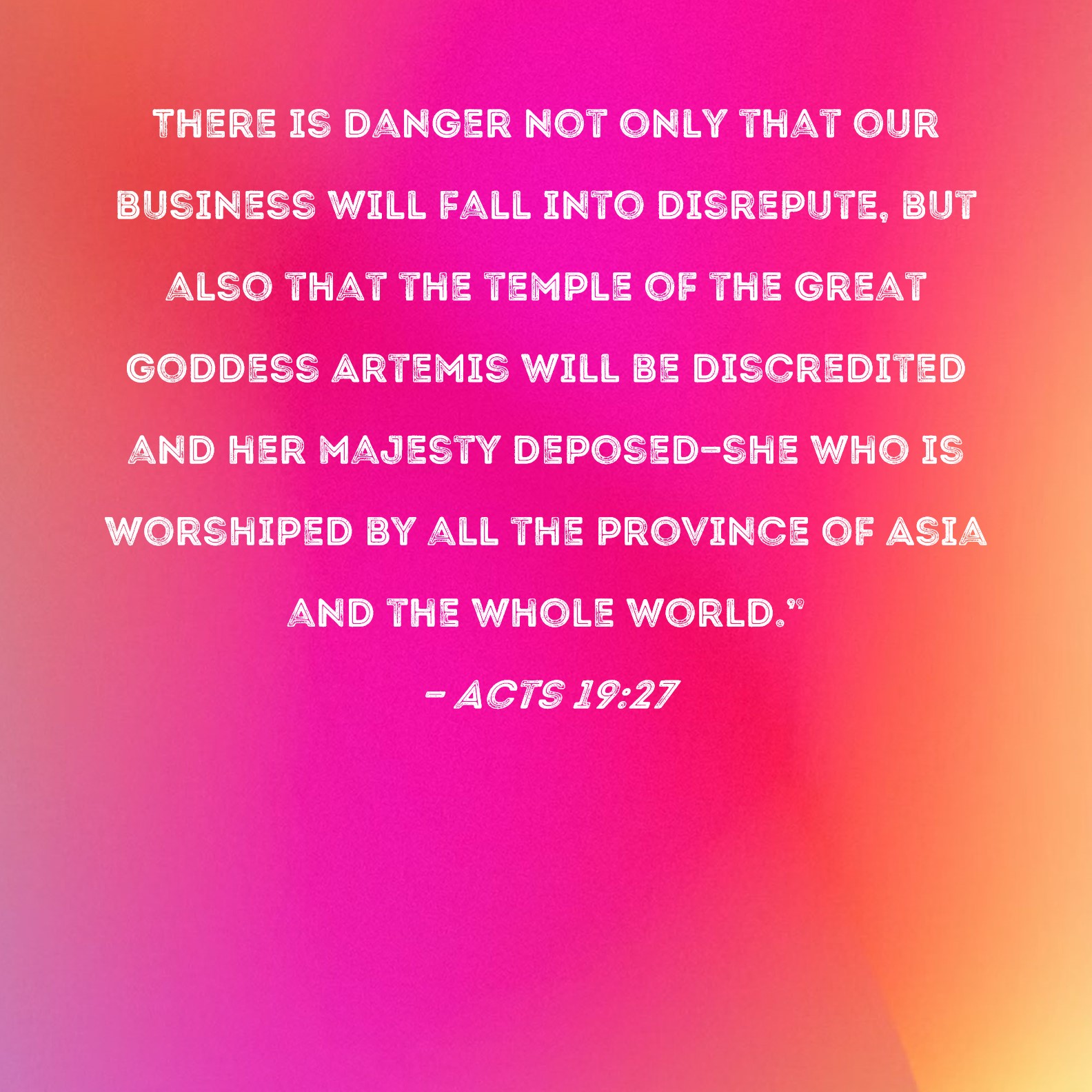 Acts 19:27 There is danger not only that our business will fall into disrepute, but also that the temple of the great goddess Artemis will be discredited and her majesty deposed--she who is worshiped by all the province of Asia and the whole world."
