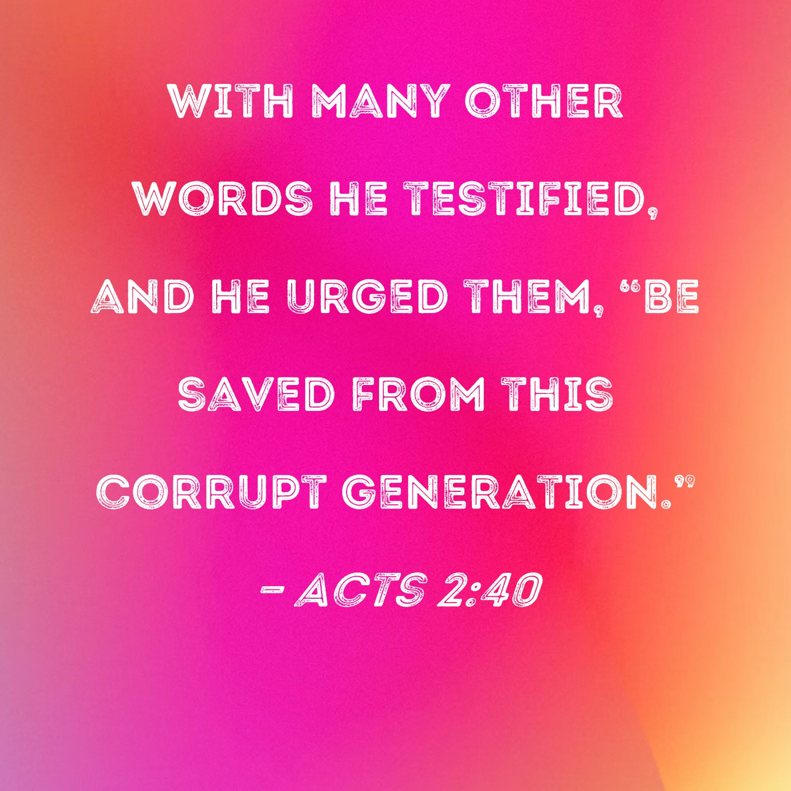 Acts 2:40 With many other words he testified, and he urged them, "Be saved from this corrupt generation."