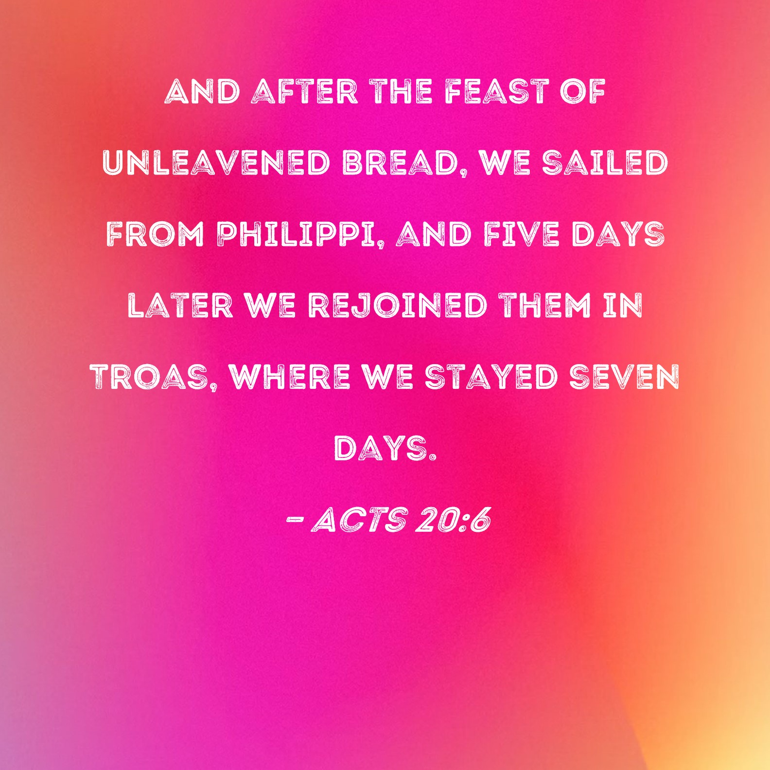 BSB: And after the Feast of Unleavened Bread, we sailed from Philippi, and five days later we rejoined them in Troas, where we stayed seven days. KJV: And we sailed away from Philippi after the days of unleavened bread, and came unto them to Troas in five days; where we abode seven days. DRB: But we sailed from Philippi after the days of the Azymes, and came to them to Troas in five days, where we abode seven days. DBT: but we sailed away from Philippi after the days of unleavened bread, and we came to them to Troas in five days, where we spent seven days. ERV: And we sailed away from Philippi after the days of unleavened bread, and came unto them to Troas in five days; where we tarried seven days. WBT: And we sailed away from Philippi, after the days of unleavened bread, and came to them to Troas in five days; where we abode seven days. WEB: We sailed away from Philippi after the days of Unleavened Bread, and came to them at Troas in five days, where we stayed seven days. YLT: and we sailed, after the days of the unleavened food, from Philippi, and came unto them to Troas in five days, where we abode seven days.Links Acts 20:6 NIV • Acts 20:6 NLT • Acts 20:6 ESV • Acts 20:6 NASB • Acts 20:6 KJV • Acts 20:6 Interlinear • Acts 20:6 Commentaries • Acts 20:6 Parallel Texts • Acts 20:6 Bible Apps • Acts 20:6 Parallel • Bible Hub |