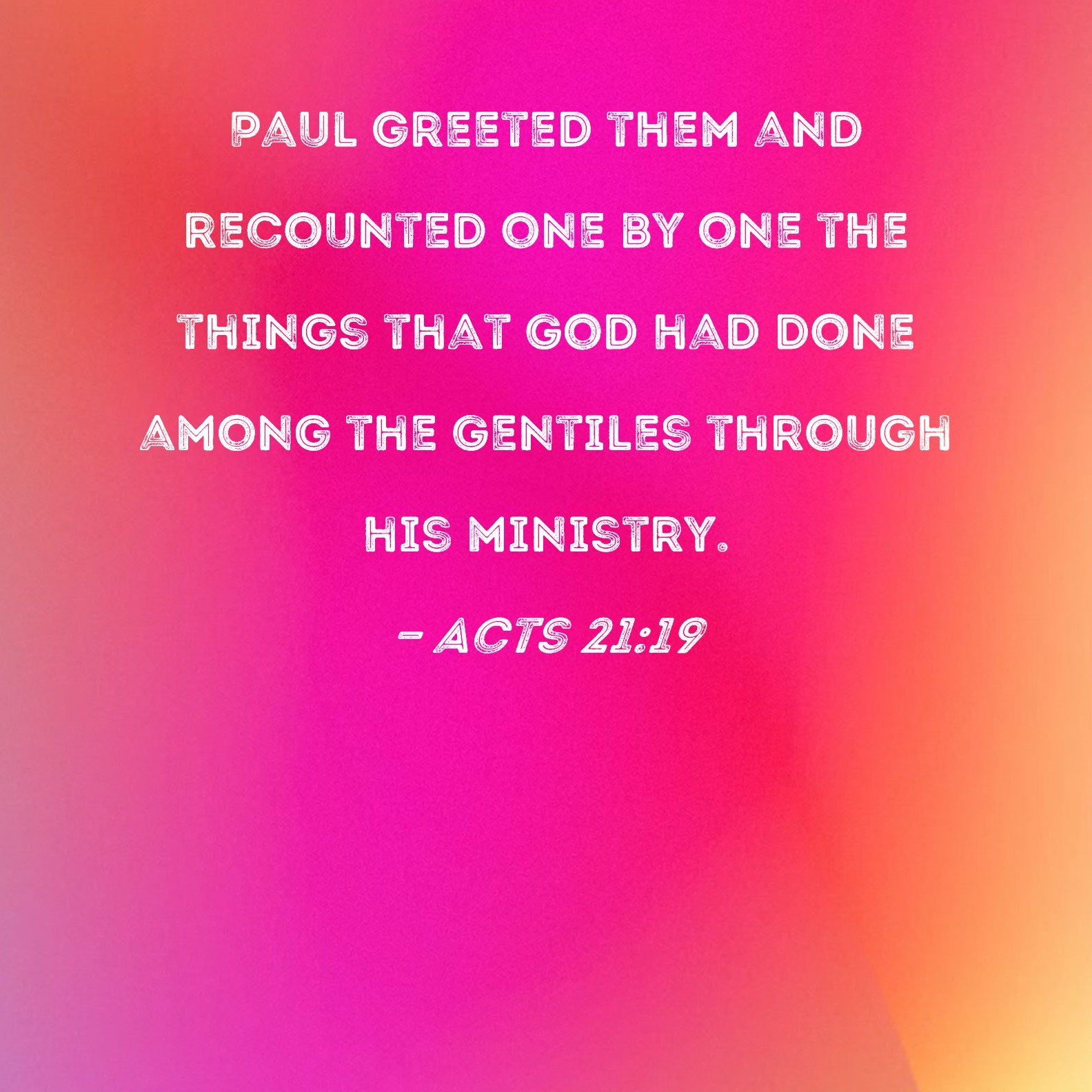 Acts 21:19 Paul greeted them and recounted one by one the things that God had done among the Gentiles through his ministry.