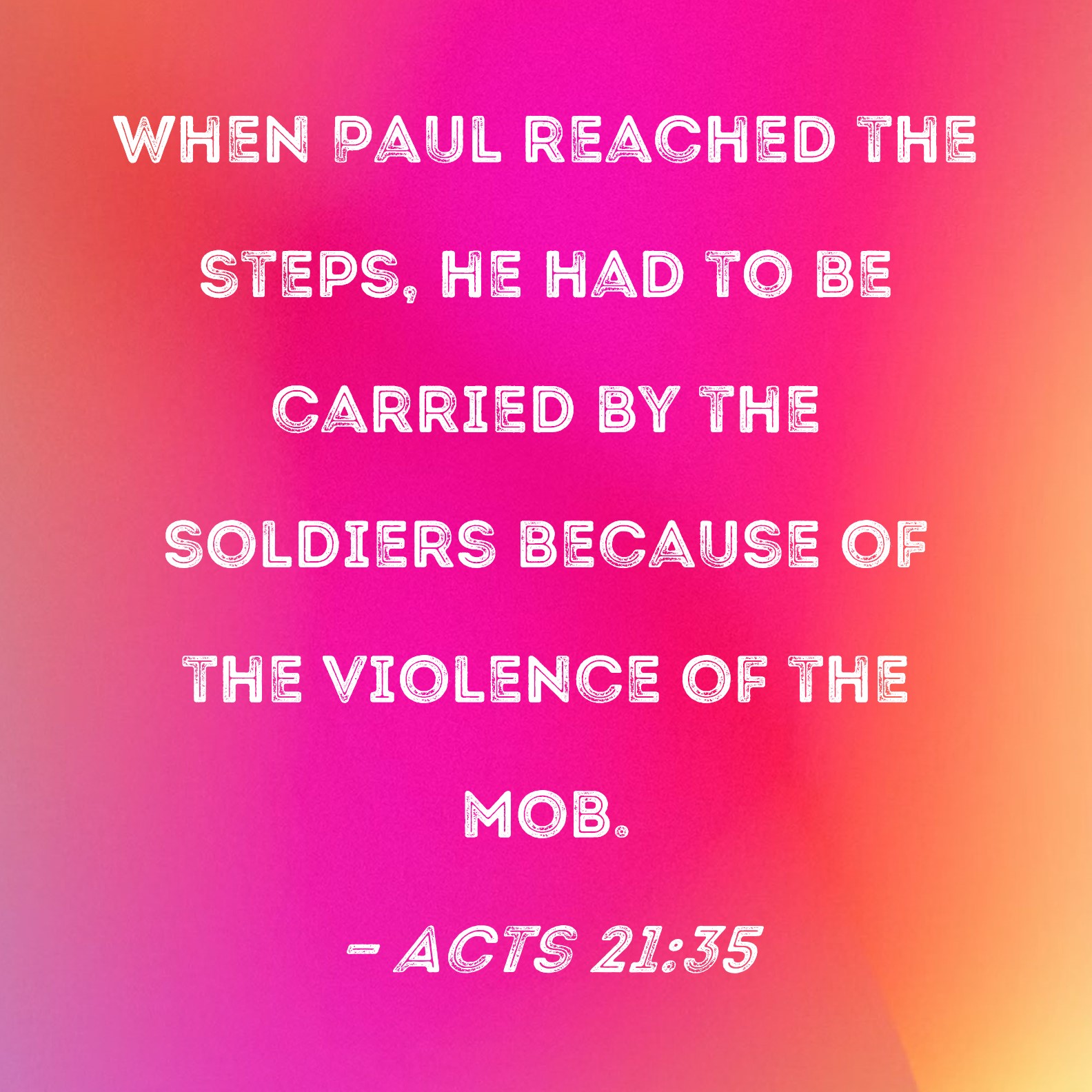 Acts 21:35 When Paul reached the steps, he had to be carried by the soldiers because of the violence of the mob.