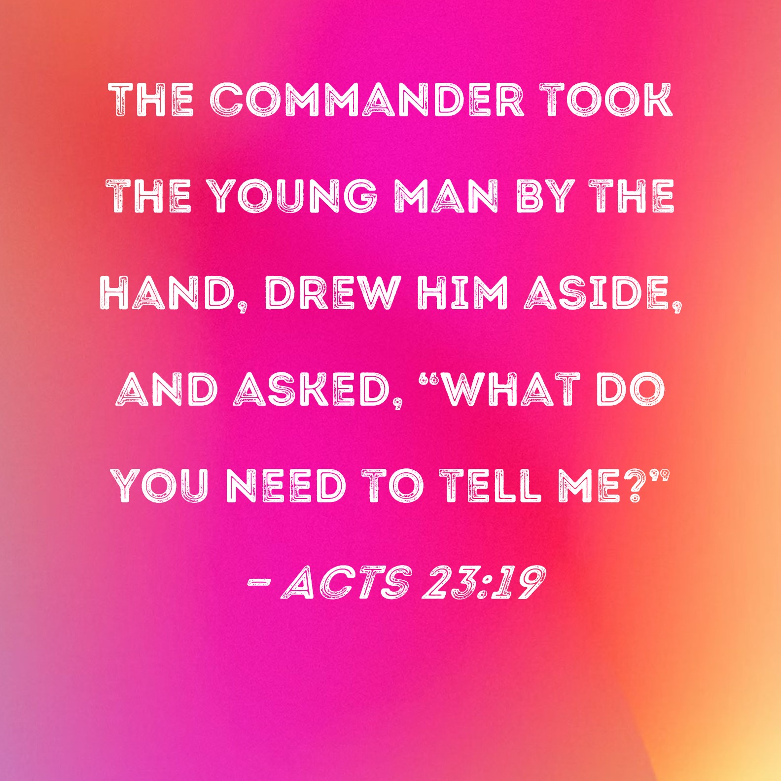 Acts 23:19 The commander took the young man by the hand, drew him aside, and asked, "What do you need to tell me?"
