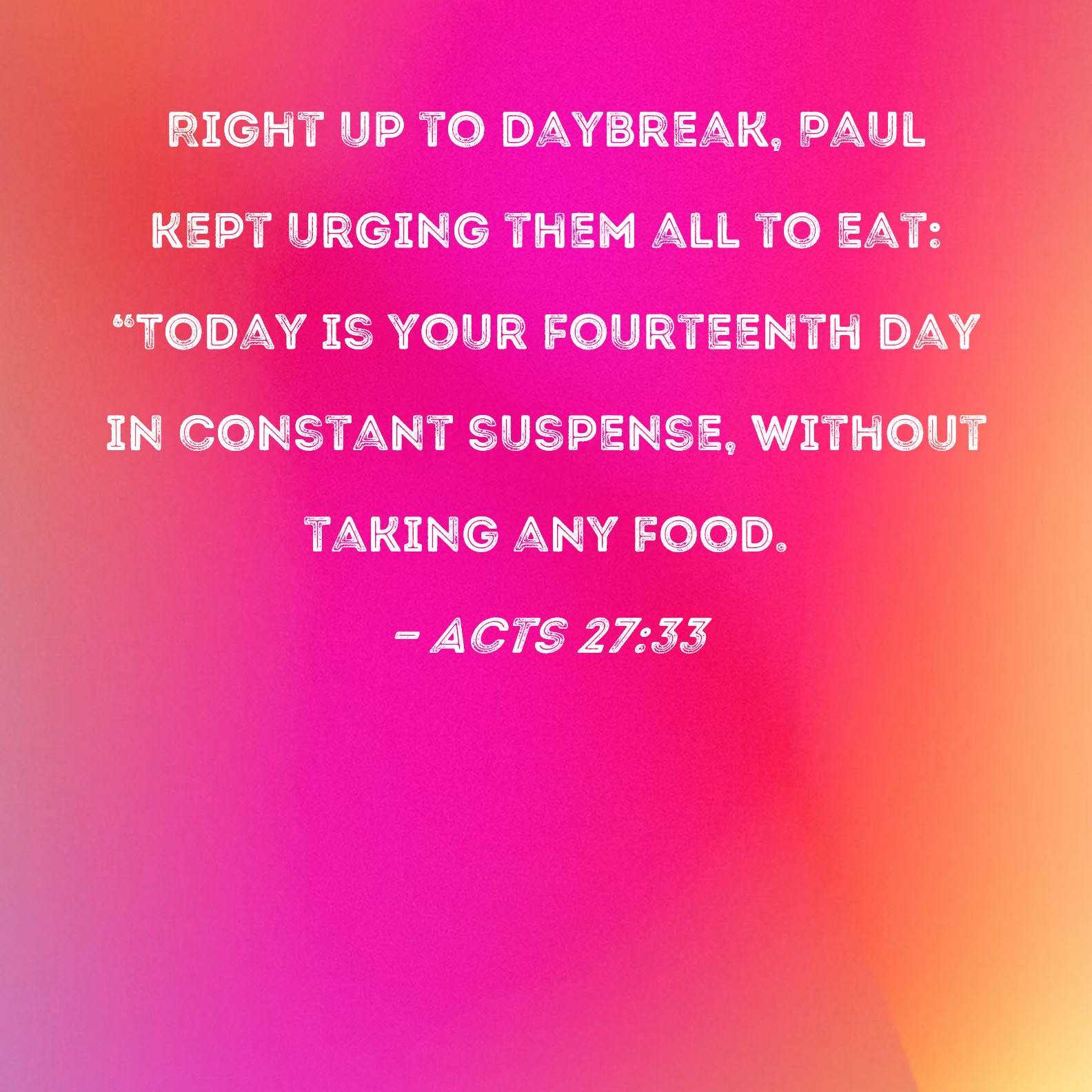 Acts 27:33 Right up to daybreak, Paul kept urging them all to eat: "Today is your fourteenth day in constant suspense, without taking any food.