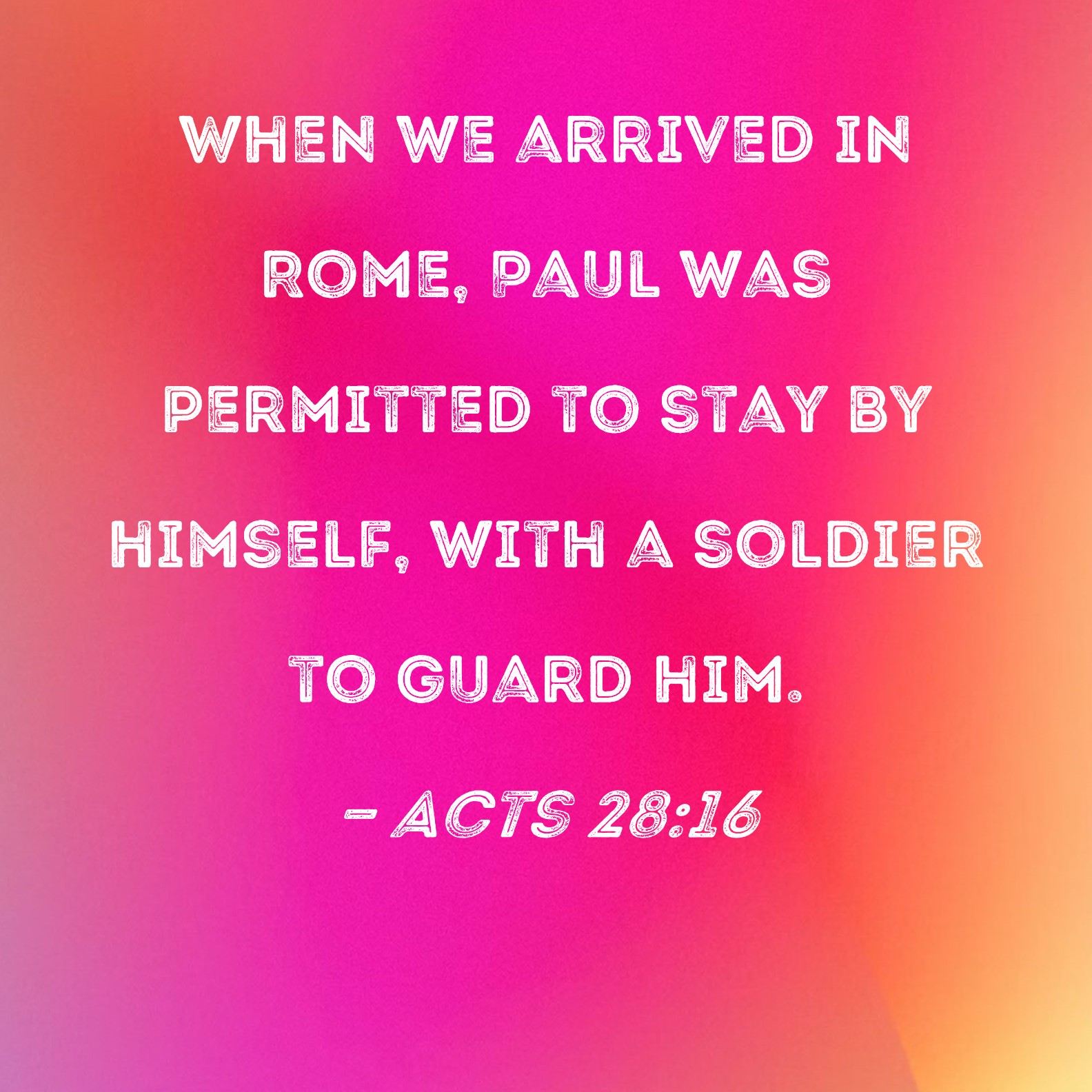 Acts 28:16 When we arrived in Rome, Paul was permitted to stay by himself, with a soldier to guard him.