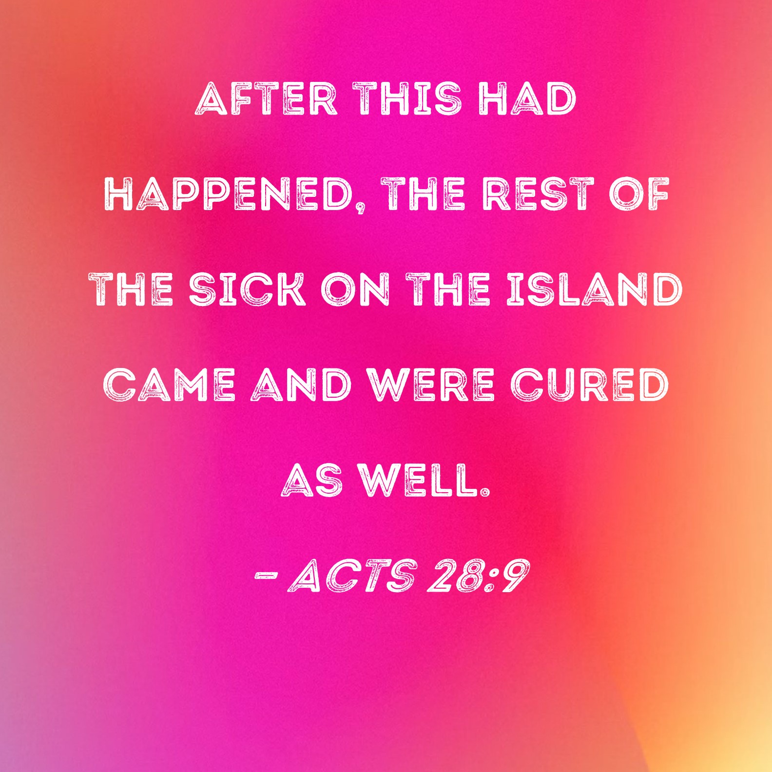 Acts 28:9 After this had happened, the rest of the sick on the island came and were cured as well.