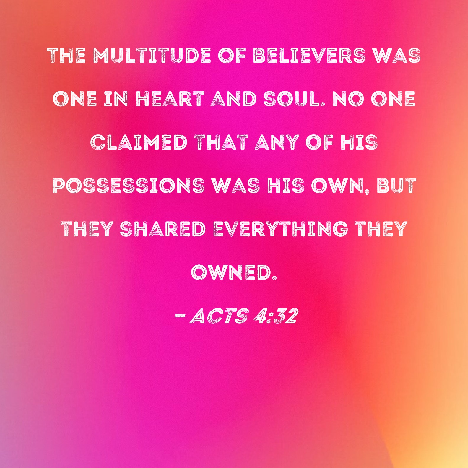 Acts 4:32 The multitude of believers was one in heart and soul. No one claimed that any of his possessions was his own, but they shared everything they owned.
