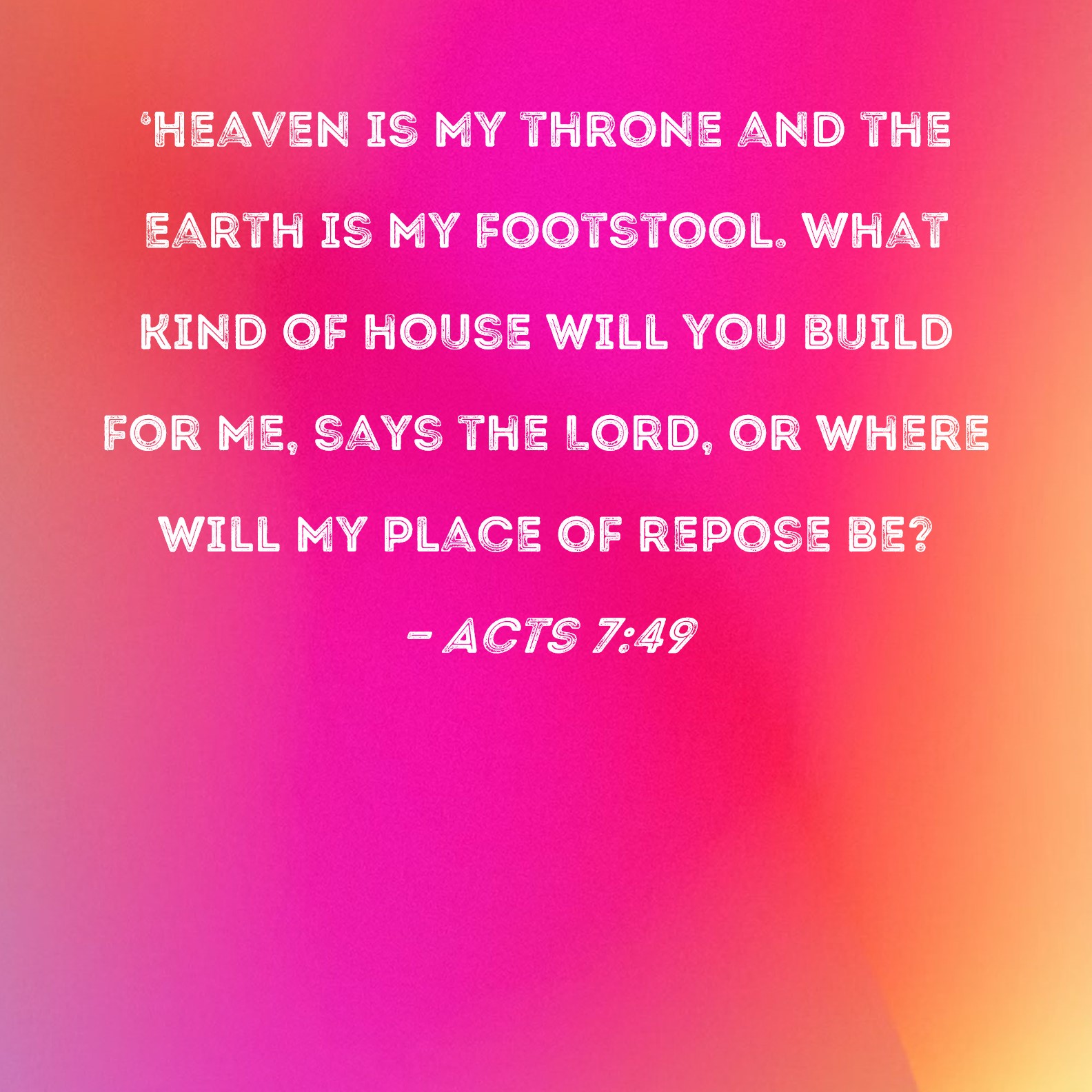 Acts 7:49 Heaven is My throne and the earth is My footstool. What kind of house will you build for Me, says the Lord, or where will My place of repose be?