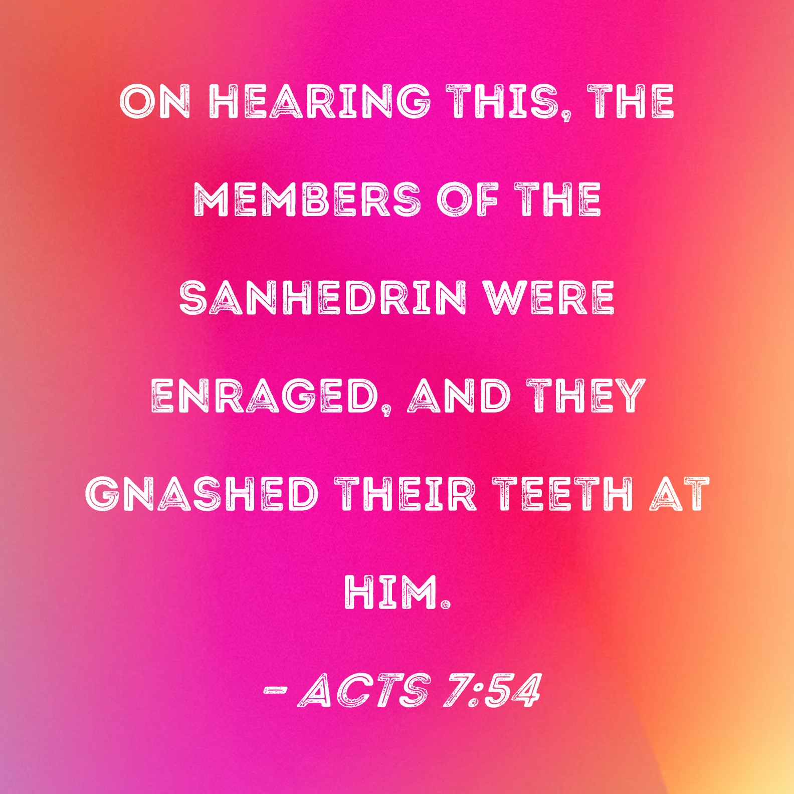 Acts 7:54 On hearing this, the members of the Sanhedrin were enraged, and they gnashed their teeth at him.