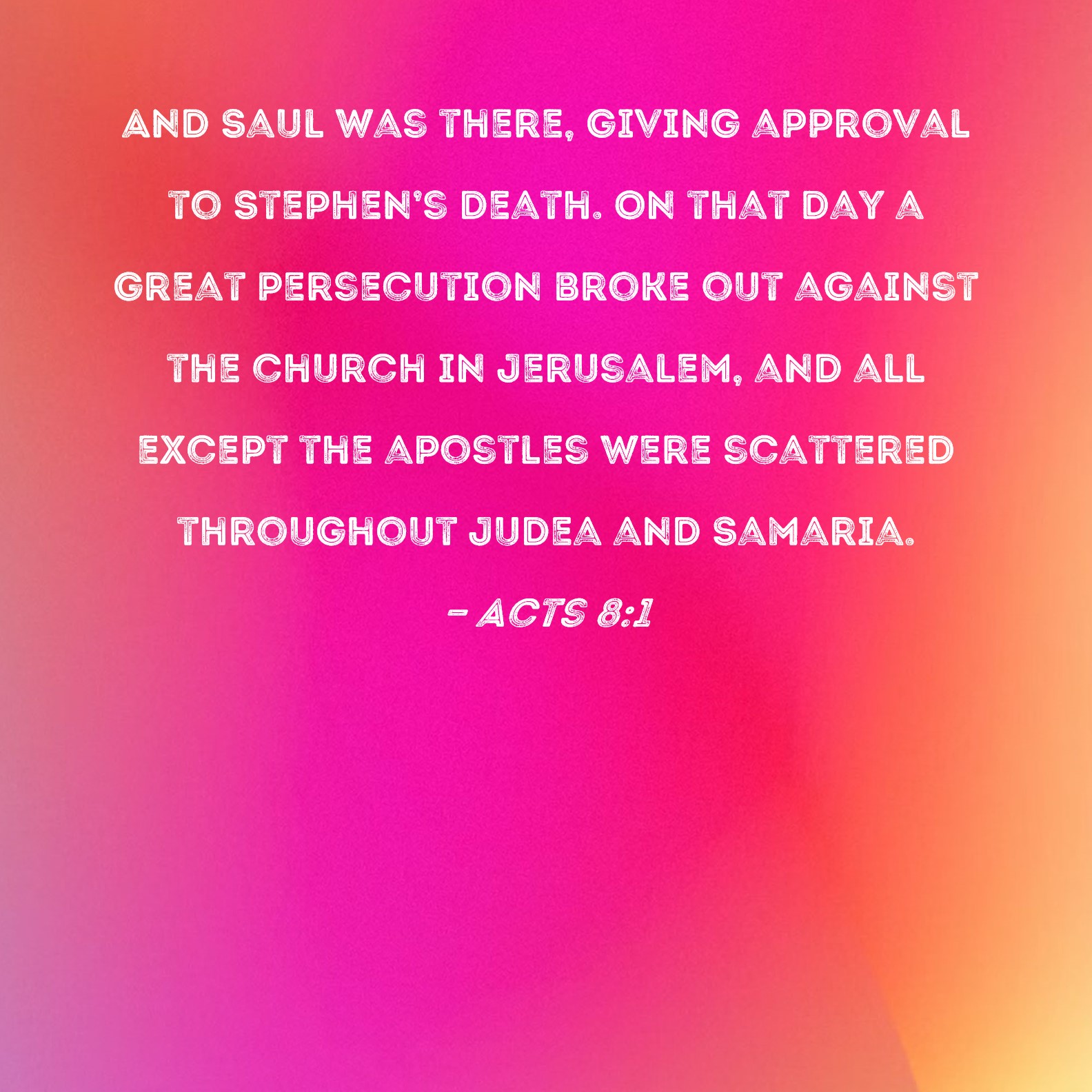 Acts 8:1 And Saul was there, giving approval to Stephen's death. On that day a great persecution broke out against the church in Jerusalem, and all except the apostles were scattered throughout Judea and Samaria.