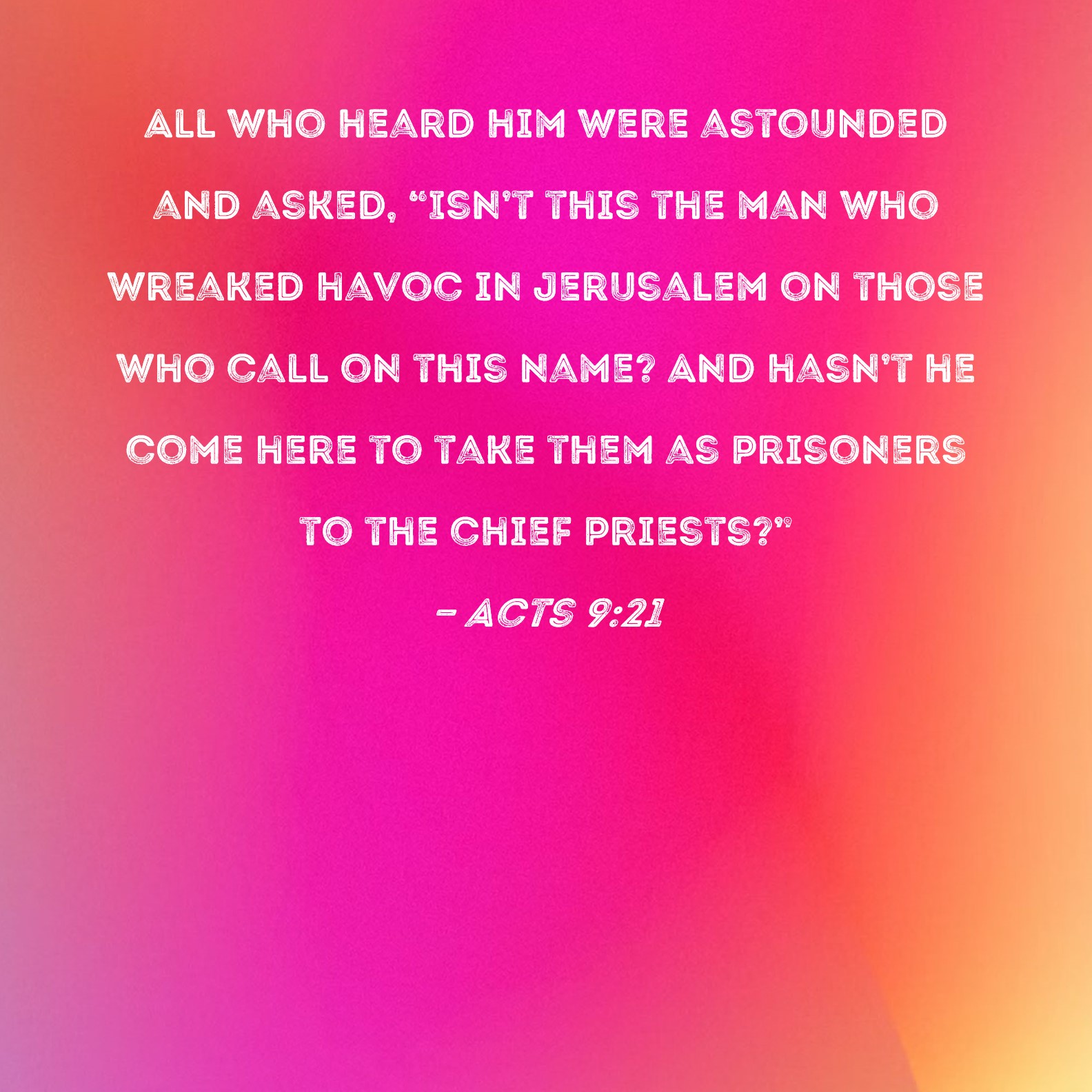 Acts 9:21 All who heard him were astounded and asked, "Isn't this the man who wreaked havoc in Jerusalem on those who call on this name? And hasn't he come here to take them as prisoners to the chief priests?"