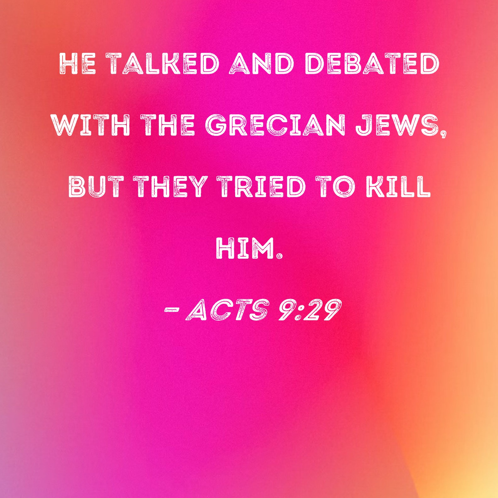Acts 9:29 He talked and debated with the Grecian Jews, but they tried to kill him.