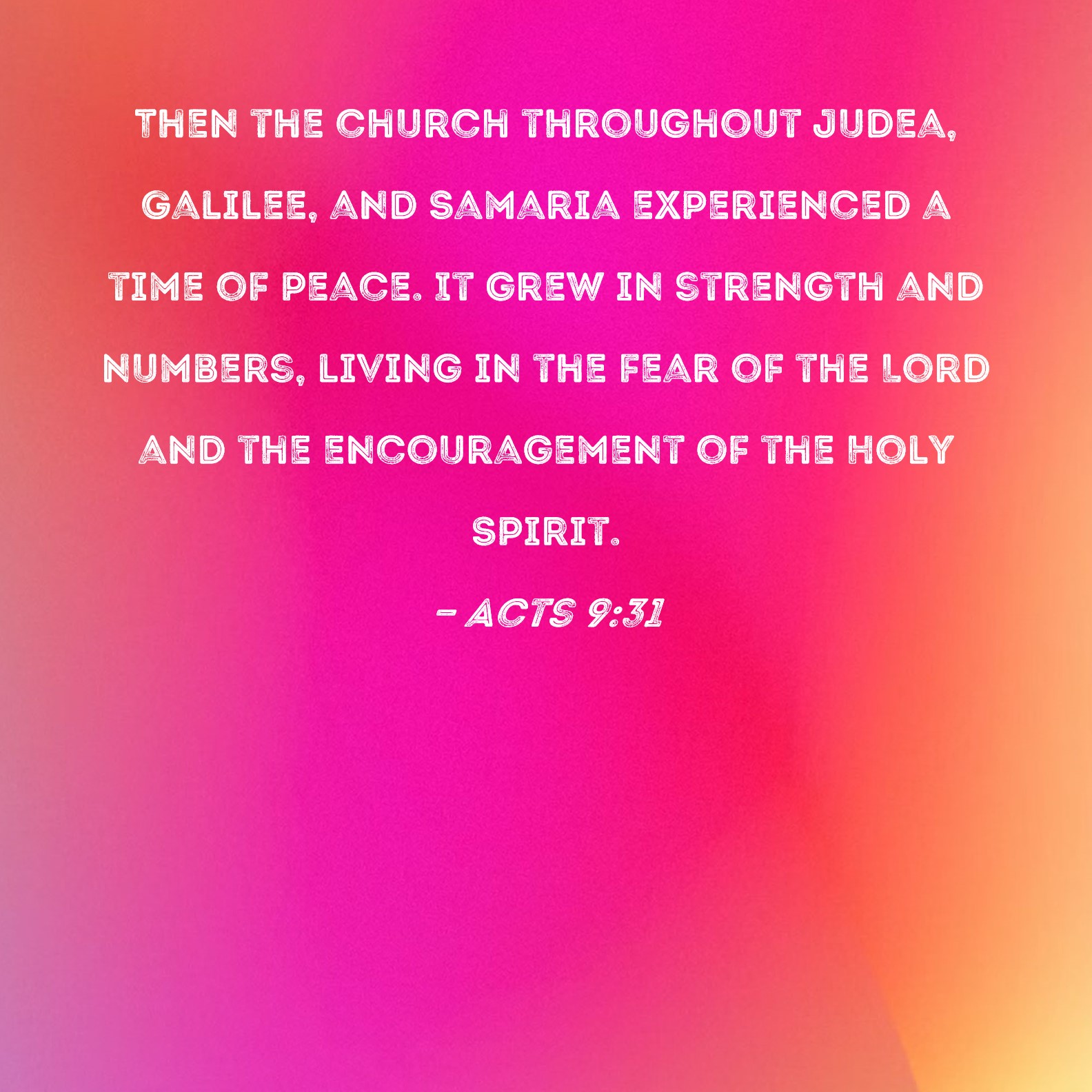 Acts 9:31 Then the church throughout Judea, Galilee, and Samaria experienced a time of peace. It grew in strength and numbers, living in the fear of the Lord and the encouragement of the Holy Spirit.