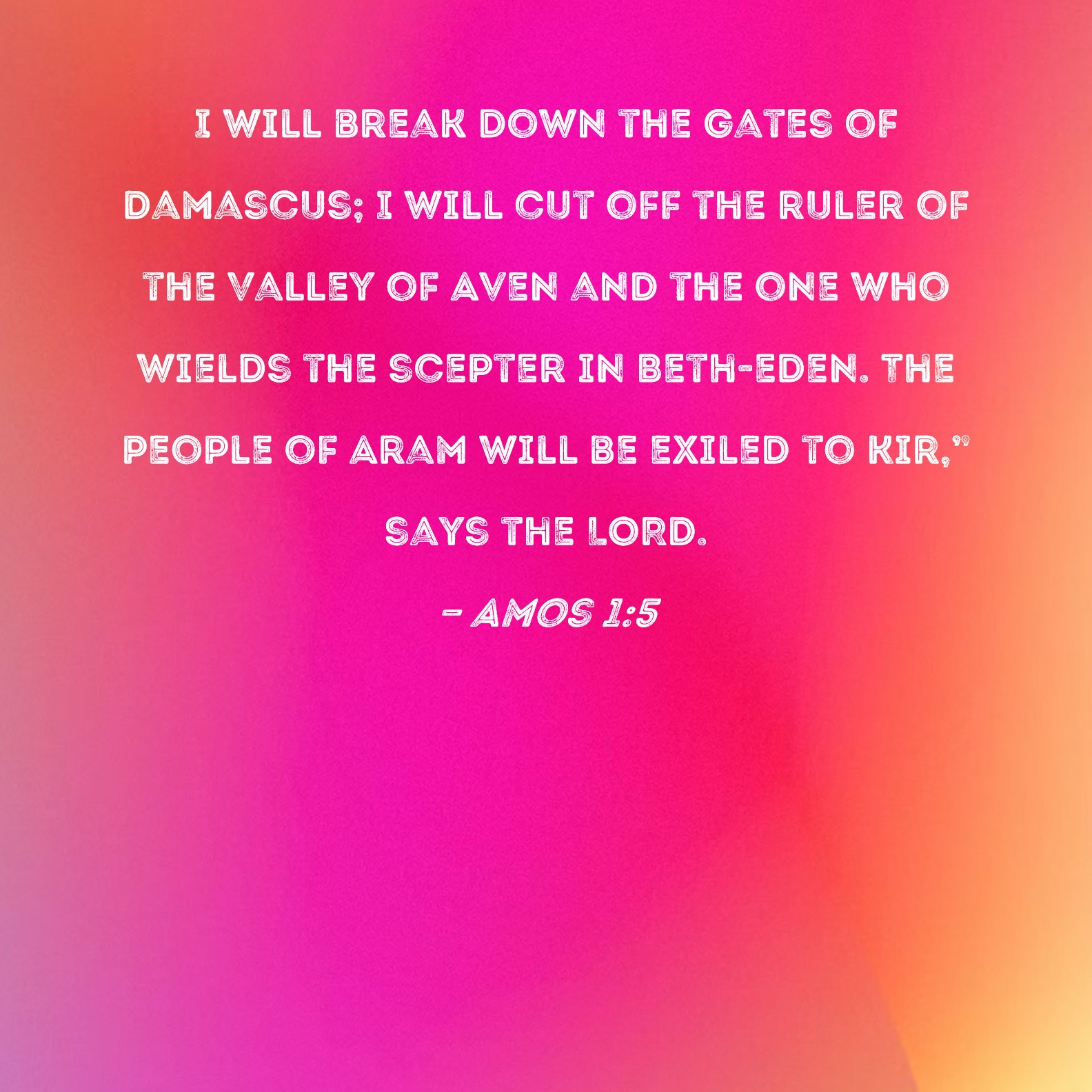 Amos 1:5 I will break down the gates of Damascus; I will cut off the ruler of the Valley of Aven and the one who wields the scepter in Beth-eden. The people of Aram will be exiled to Kir," says the LORD.