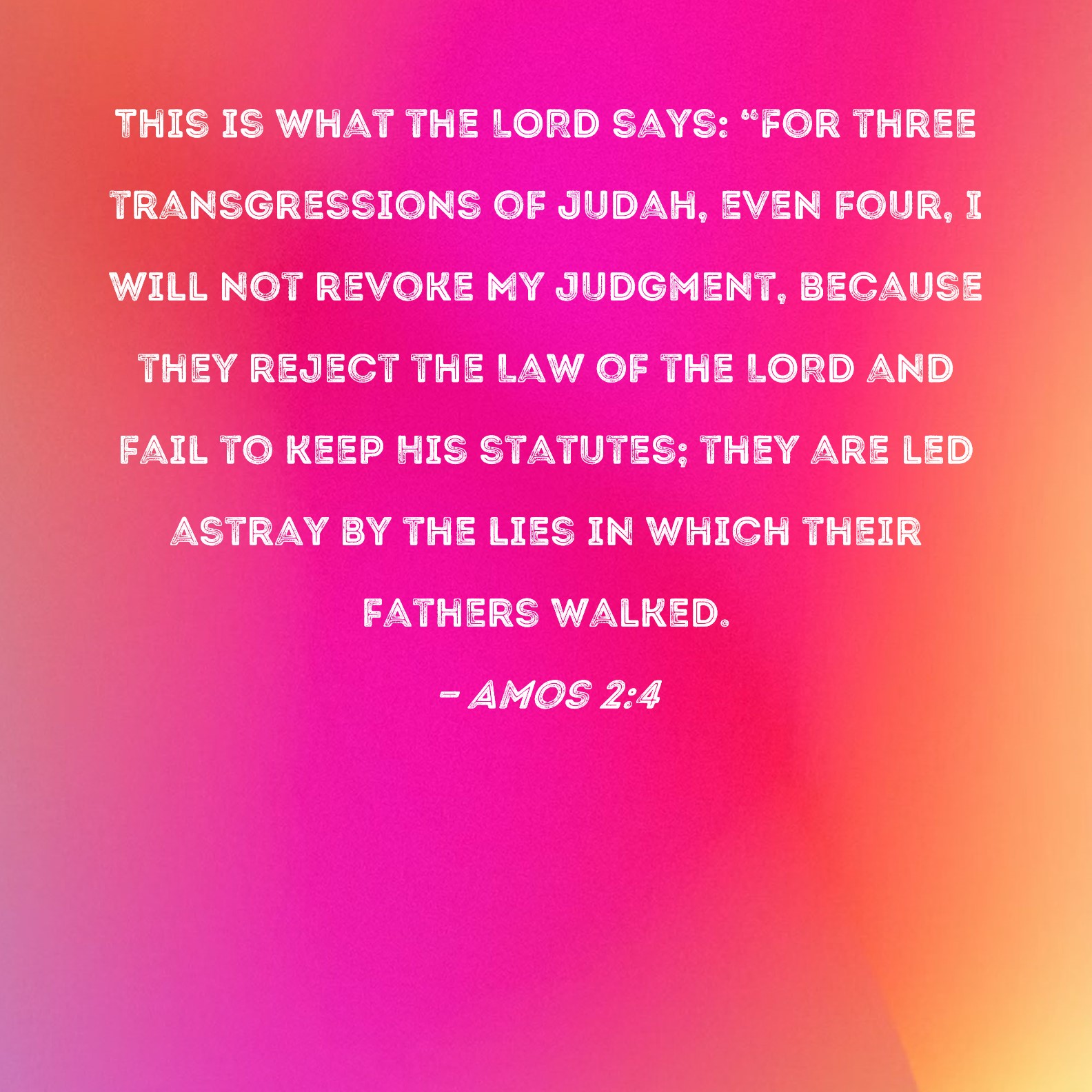 Amos 2:4 This is what the LORD says: "For three transgressions of Judah, even four, I will not revoke My judgment, because they reject the Law of the LORD and fail to keep His statutes; they are led astray by the lies in which their fathers walked.