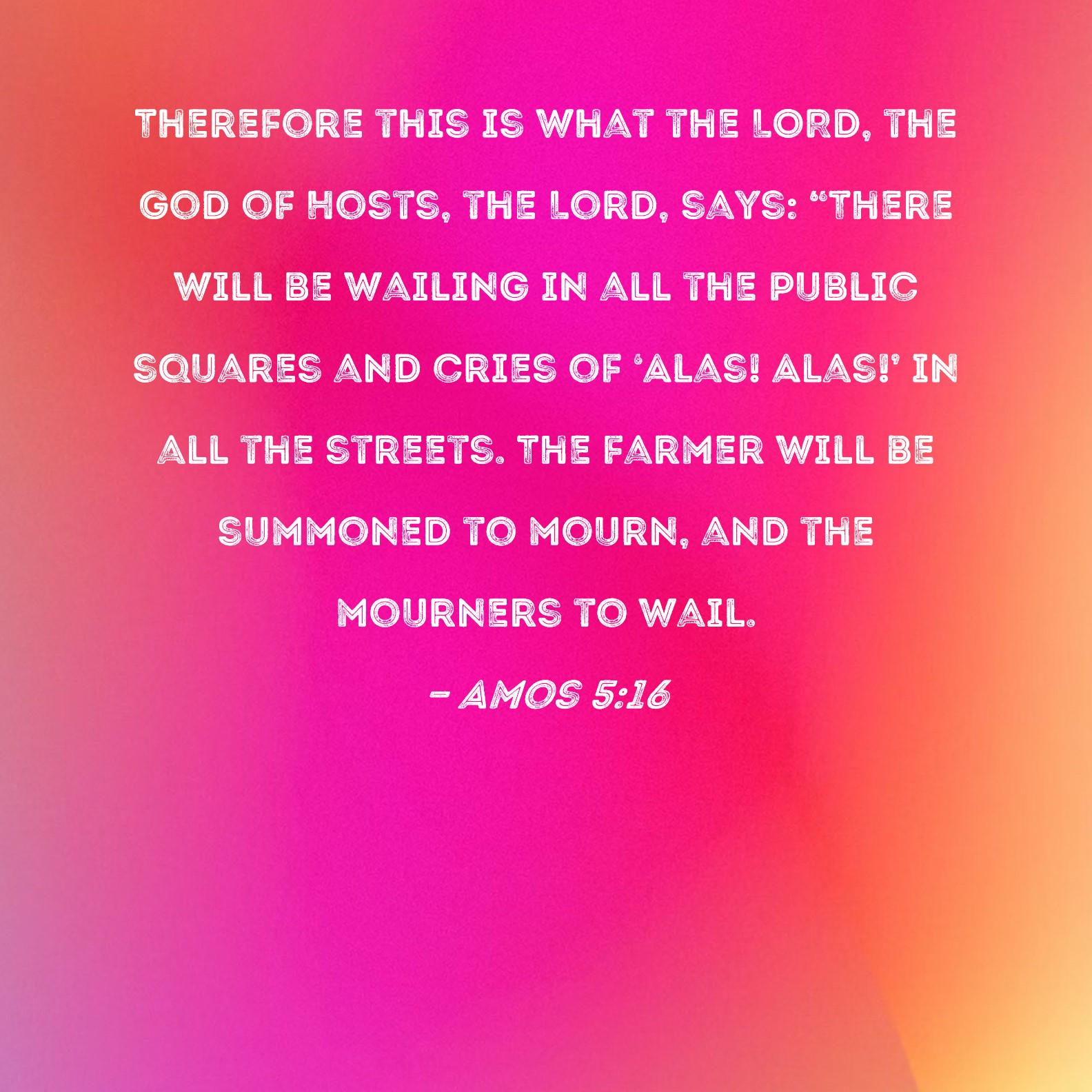 Amos 5:16 Therefore this is what the LORD, the God of Hosts, the Lord, says: "There will be wailing in all the public squares and cries of 'Alas! Alas!' in all the streets. The farmer will be summoned to mourn, and the mourners to wail.