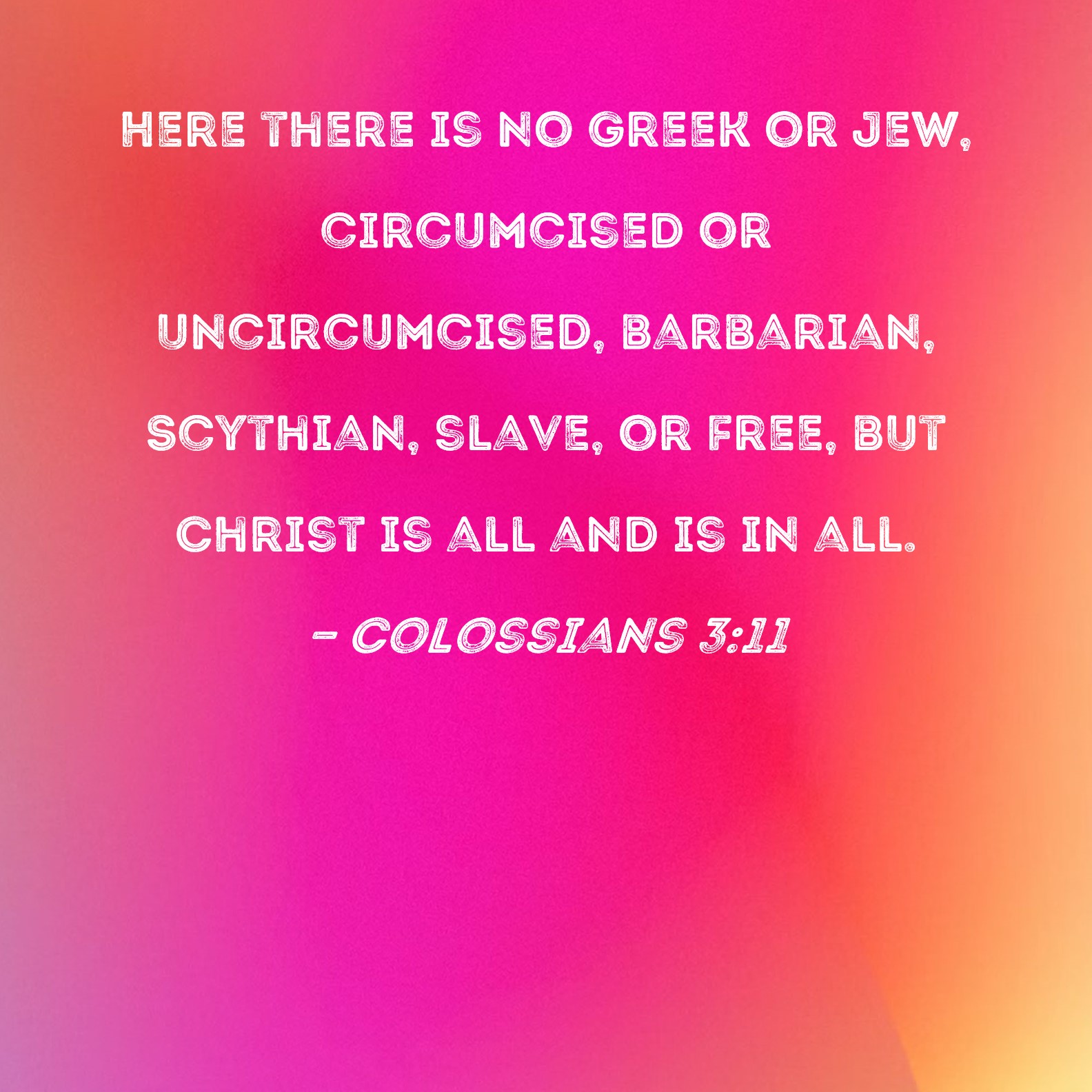 Colossians 3:11 Here there is no Greek or Jew, circumcised or uncircumcised, barbarian, Scythian, slave, or free, but Christ is all and is in all.