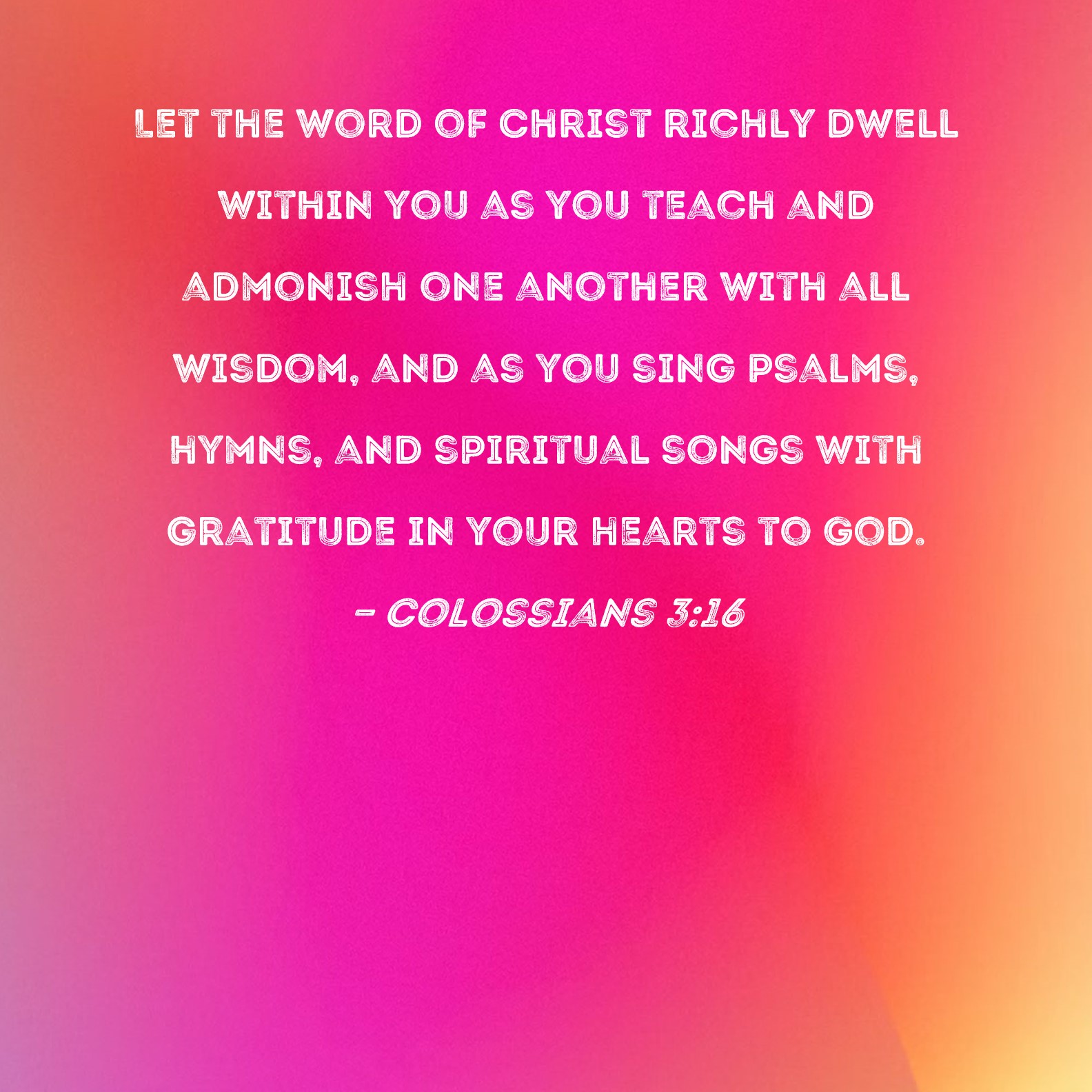 Colossians 3:16 Let the word of Christ richly dwell within you as you teach and admonish one another with all wisdom, and as you sing psalms, hymns, and spiritual songs with gratitude in your hearts to God.
