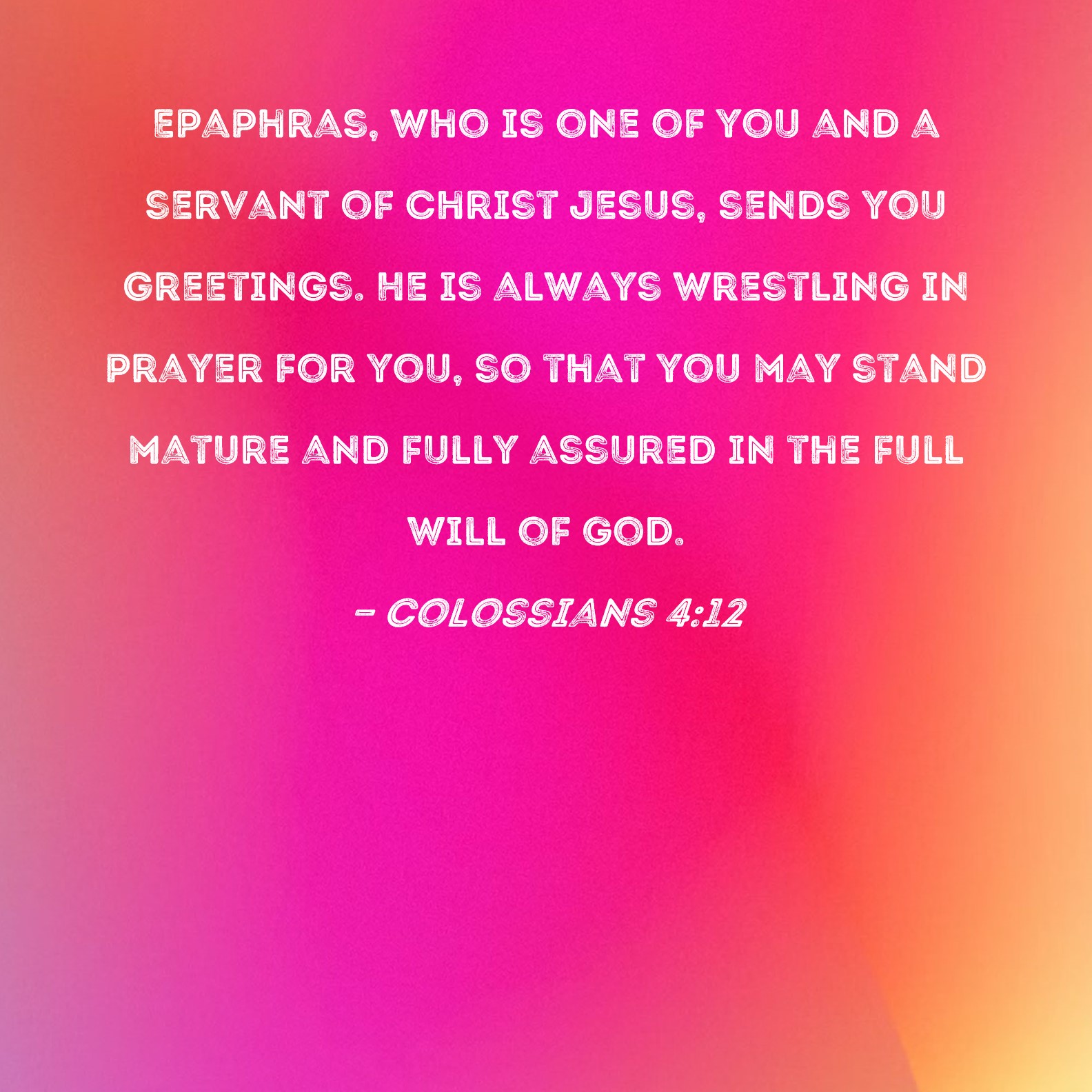 Colossians 4:12 Epaphras, who is one of you and a servant of Christ Jesus, sends you greetings. He is always wrestling in prayer for you, so that you may stand mature and fully assured in the full will of God.