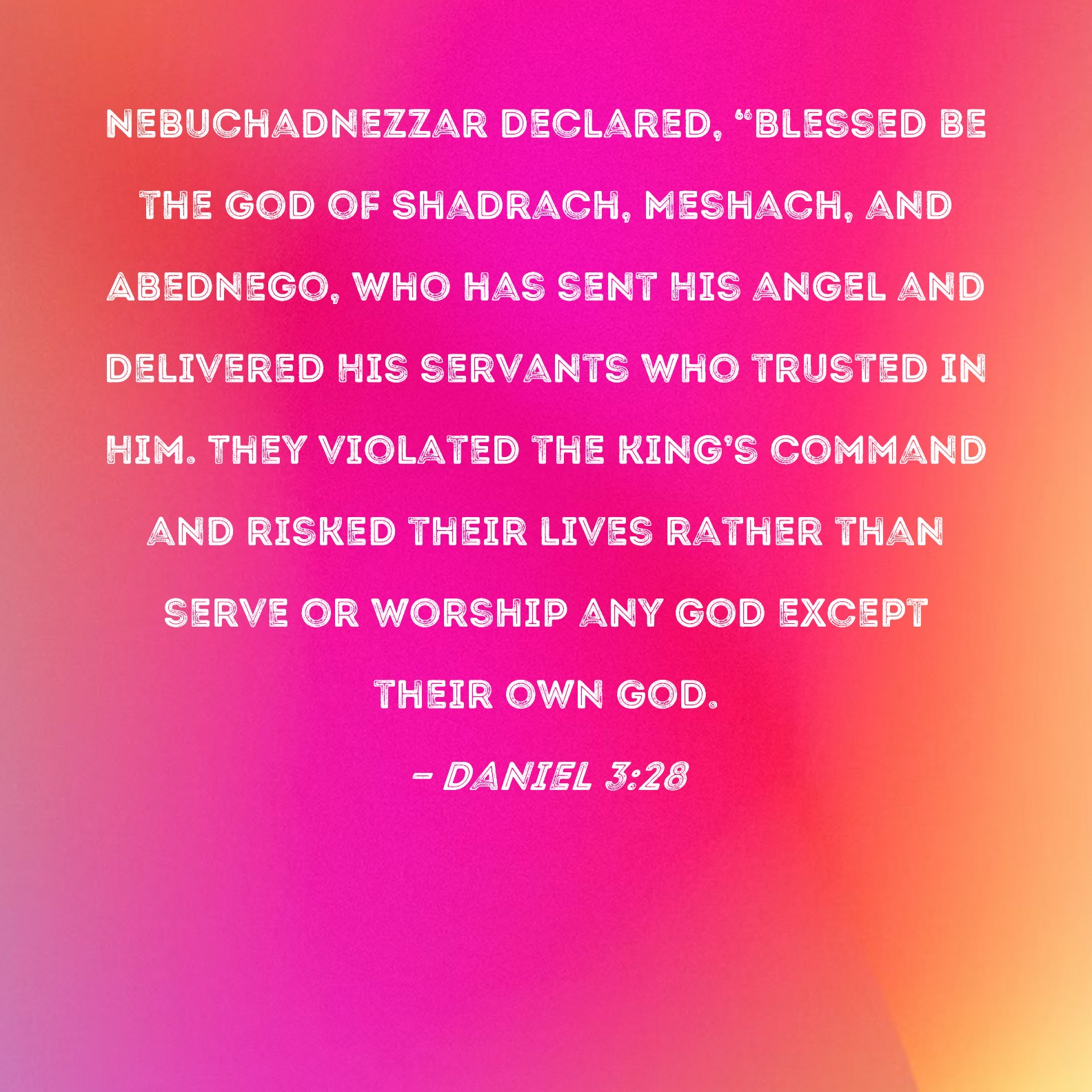 Daniel 3:28 Nebuchadnezzar declared, "Blessed be the God of Shadrach, Meshach, and Abednego, who has sent His angel and delivered His servants who trusted in Him. They violated the king's command and risked their lives rather than serve or worship any god except their own God.