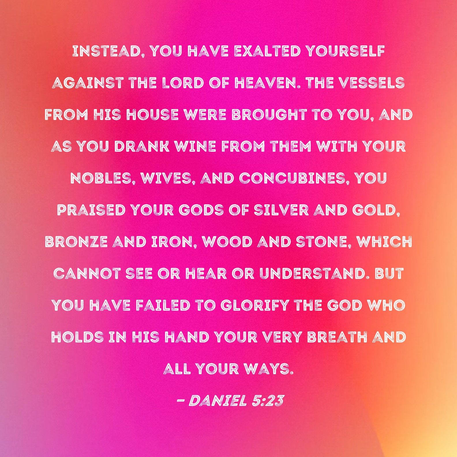 Daniel 5:23 Instead, you have exalted yourself against the Lord of heaven. The vessels from His house were brought to you, and as you drank wine from them with your nobles, wives, and concubines, you praised your gods of silver and gold, bronze and iron, wood and stone, which cannot see or hear or understand. But you have failed to glorify the God who holds in His hand your very breath and all your ways.